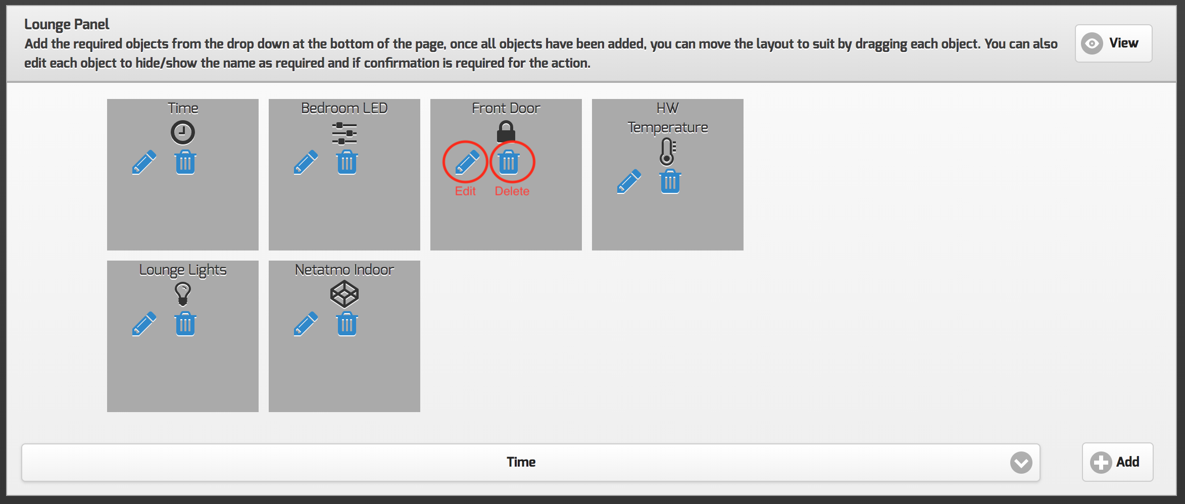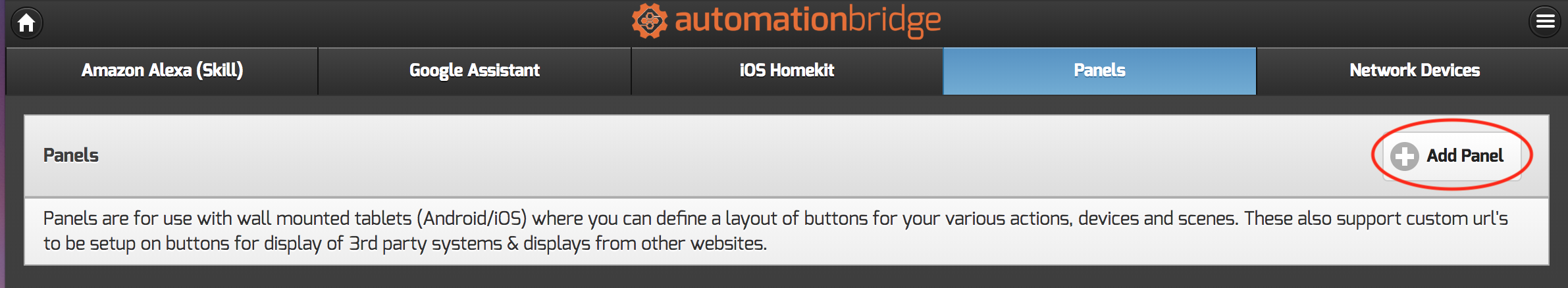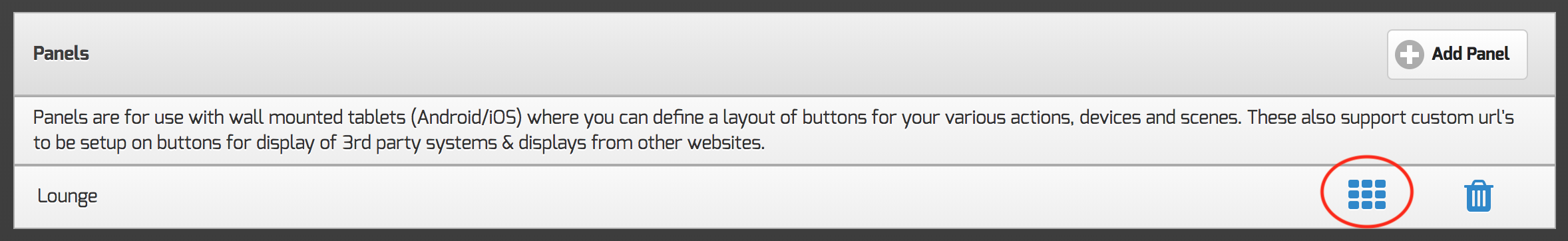Panels are for use with wall mounted tablets (Android/iOS) where you can define a layout of buttons for your various actions, devices and scenes. These also support custom url's to be setup on buttons for display of 3rd party systems & displays from other websites.
