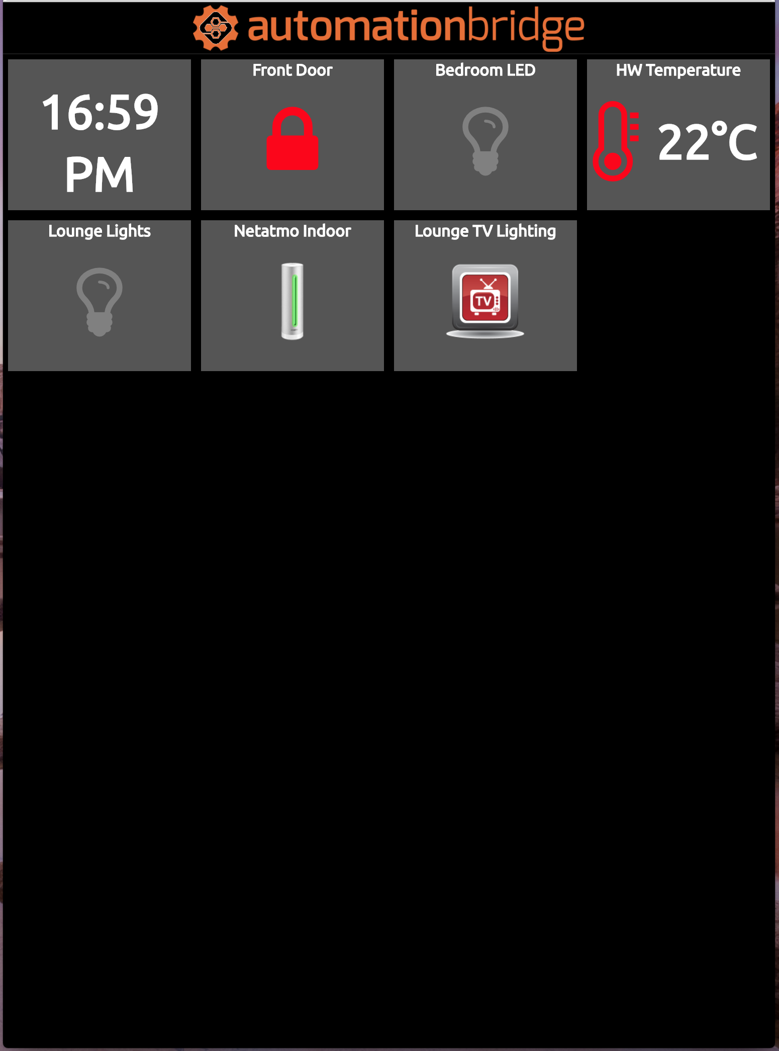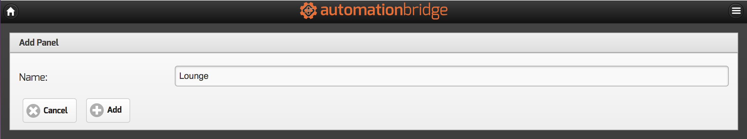 To get started, navigate to the Panels tab of the automationbridge interface, and click the Add Panel button, you can add multiple panel configurations if you have multiple tablets around your home. Each can have its own devices, colouring and fonts.