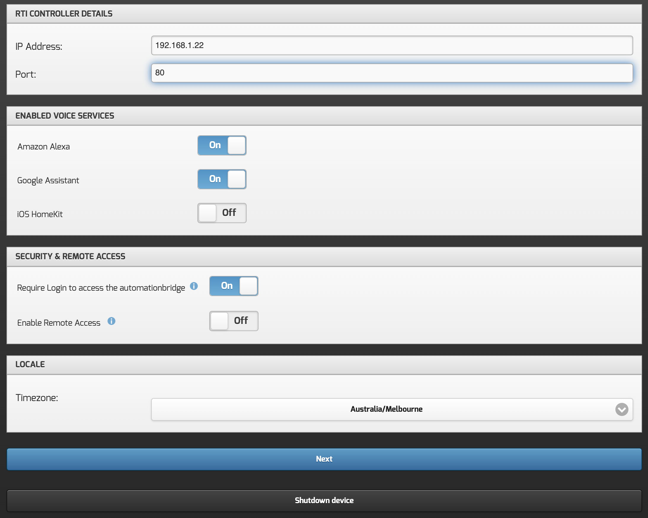 Next enter the details of your RTI controller, usually this is just the IP address and port (80), and select your required voice services, and click Next.