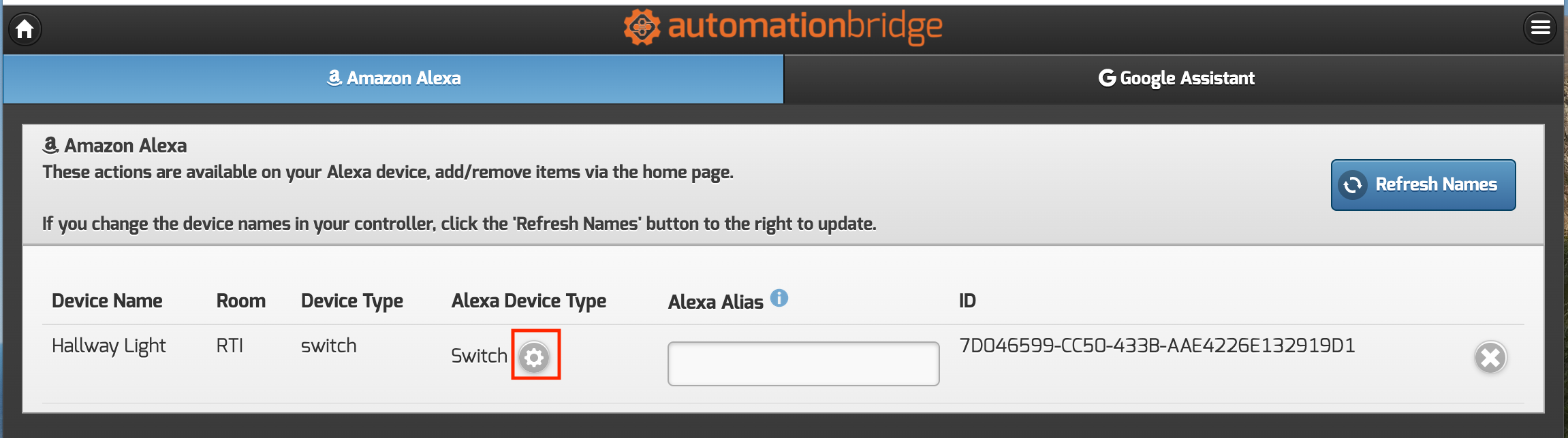 By default all devices are configured as a simple ON/OFF switch. You can however over-ride the device type by going to the voice platform pages, eg Alexa & Google. Here you will find a config button beside the device type, click this to edit and change the device type.
