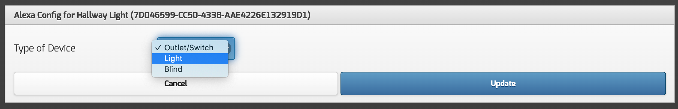 You will be able to select either Light, Switch or Blind, then click Update. This will then update the platform to have this device presented as the chosen type.
