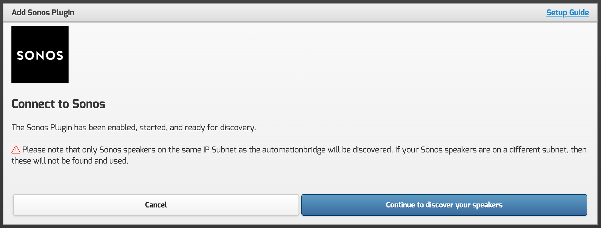 This guide assumes that you have already purchased the Sonos plugin from within the automationbridge interface. Also note this plugin will only work if your Sonos speakers are on the same subnet (network) as the automationbridge. This plugin will not work across different VLANS/subnets.