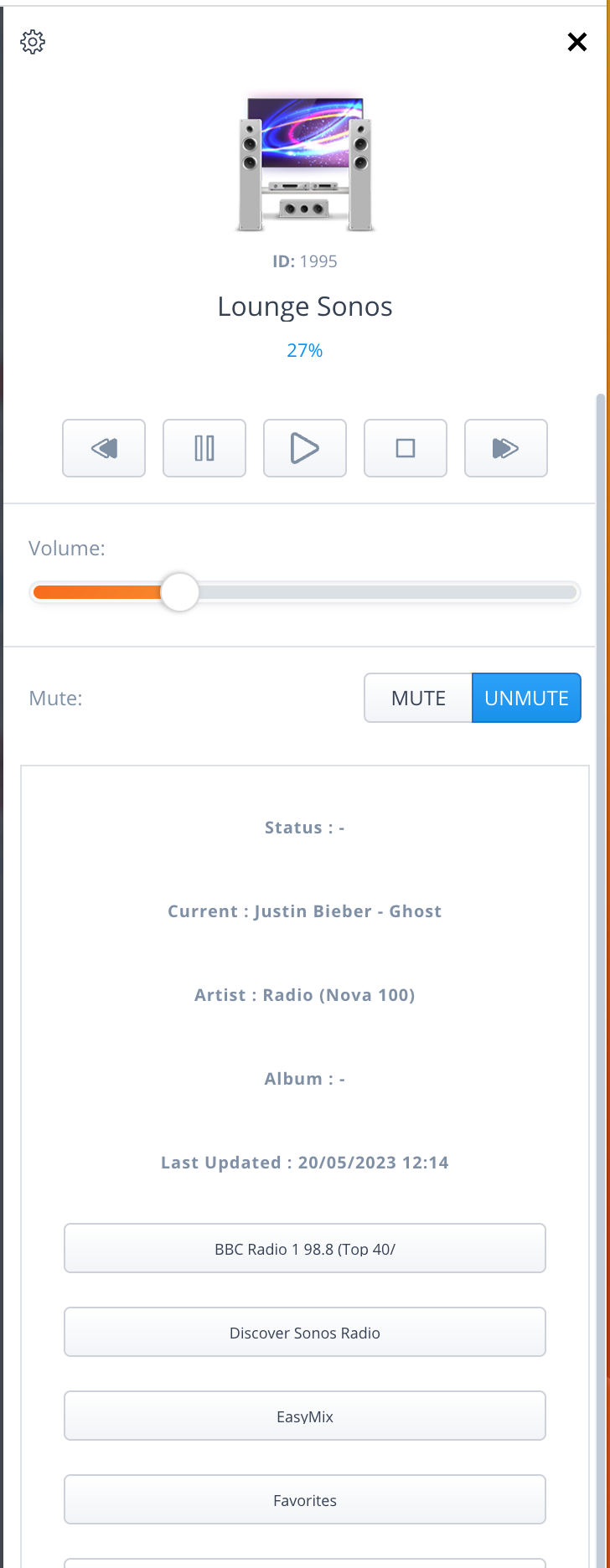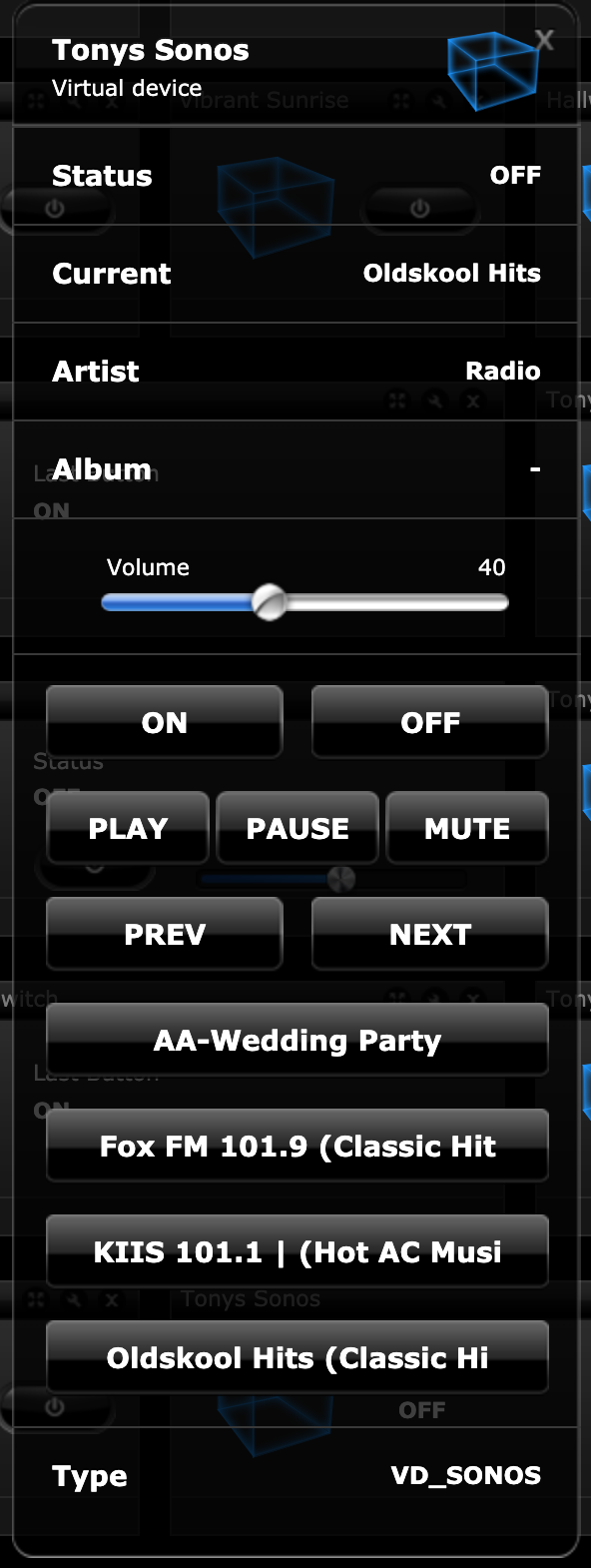 In your Fibaro HC2/HCL controller (see further down for HC3), you will now have a VD for each Sonos speaker, which will allow control, and also allow selection of your favourites.