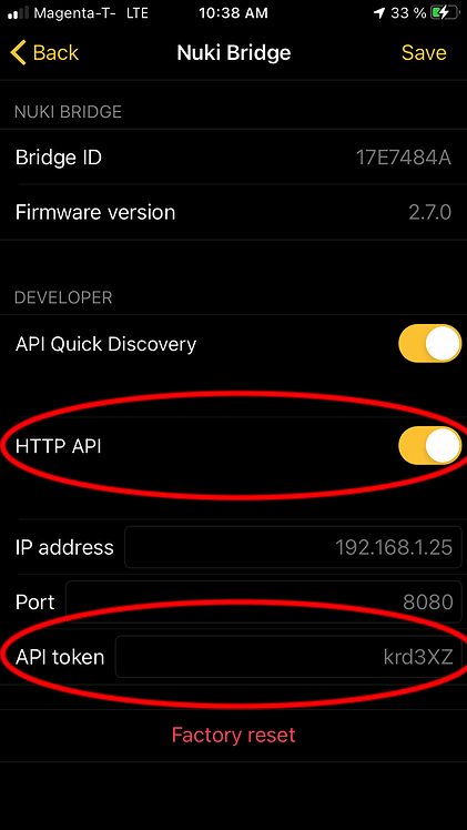 Step 2 - You will need to ensure that the HTTP API is enabled on your Nuki bridge via the Nuki app, opening the burger menu > Manage my devices > Bridge and then select the bridge to enter its settings, and enable and retrieve the required token, for example