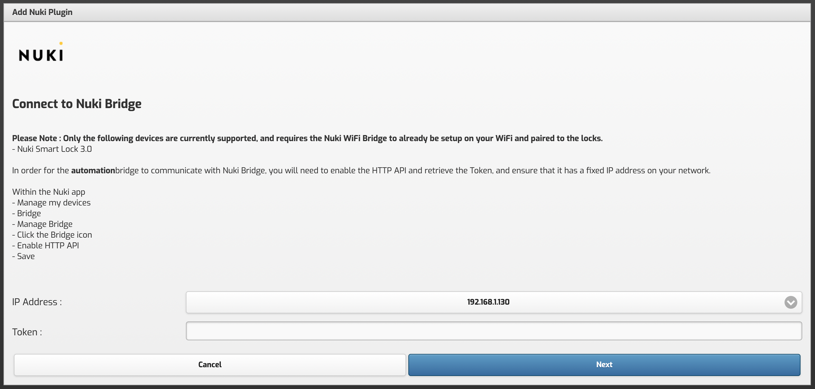 Step 3 - on the automationbridge plugin setup page, select the matching Nuki bridge and enter the token retrieved in the step above, and then click Next