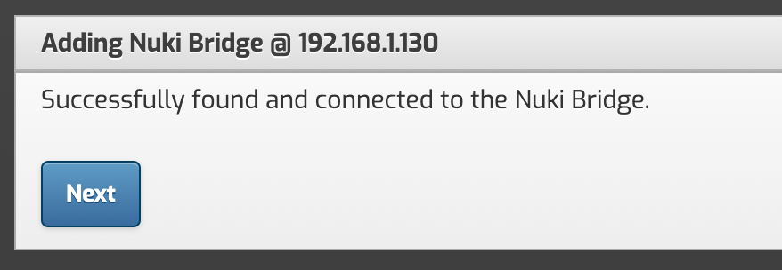 Step 4 - The automationbridge will then connect to the Nuki bridge, verifiying your token, and if successfull the following will be displayed, click Next to proceed.