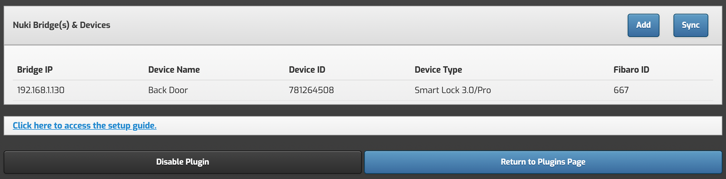 This completes the setup of the Nuki plugin, you will now be at the plugin settings page, here you can add additional bridges/locks, and perform a sync to update with existing bridges.