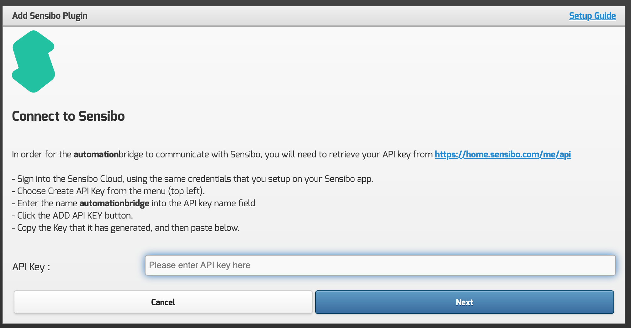 This guide assumes that you have already purchased the Sensibo plugin from within the automationbridge interface, and that you have setup the Sensibo device on your network and have it working using the Sensibo app on your phone.