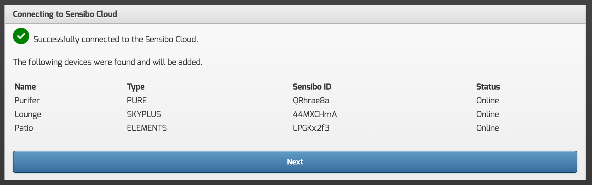 Step 3 - When you have clicked Next, the automationbridge will connect to the Sensibo Cloud, verifying your API Key, and if successful you will be presented with the next screen.
