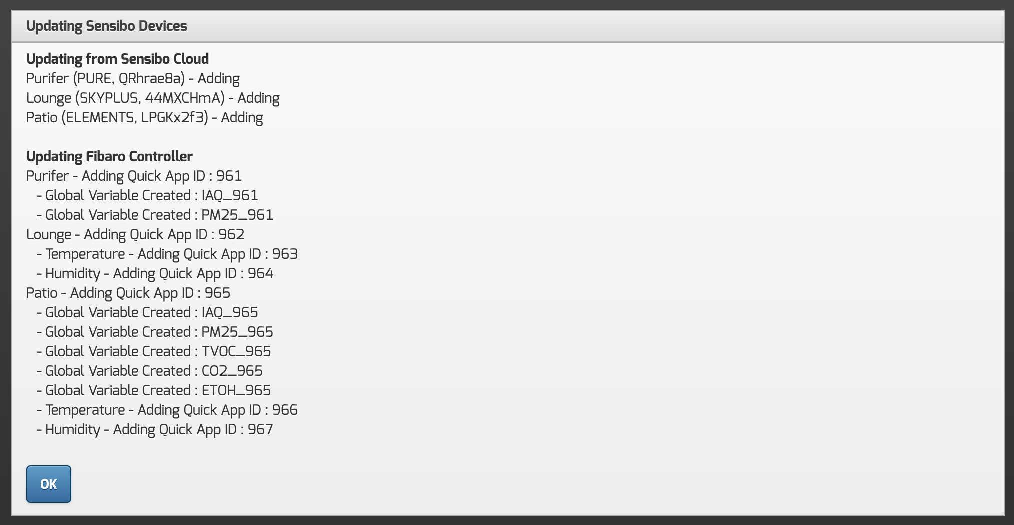 Step 4 - Click Next, this will complete the setup process and add the Sensibo devices to your controller. It will also create the global variables as required (Fibaro Only)