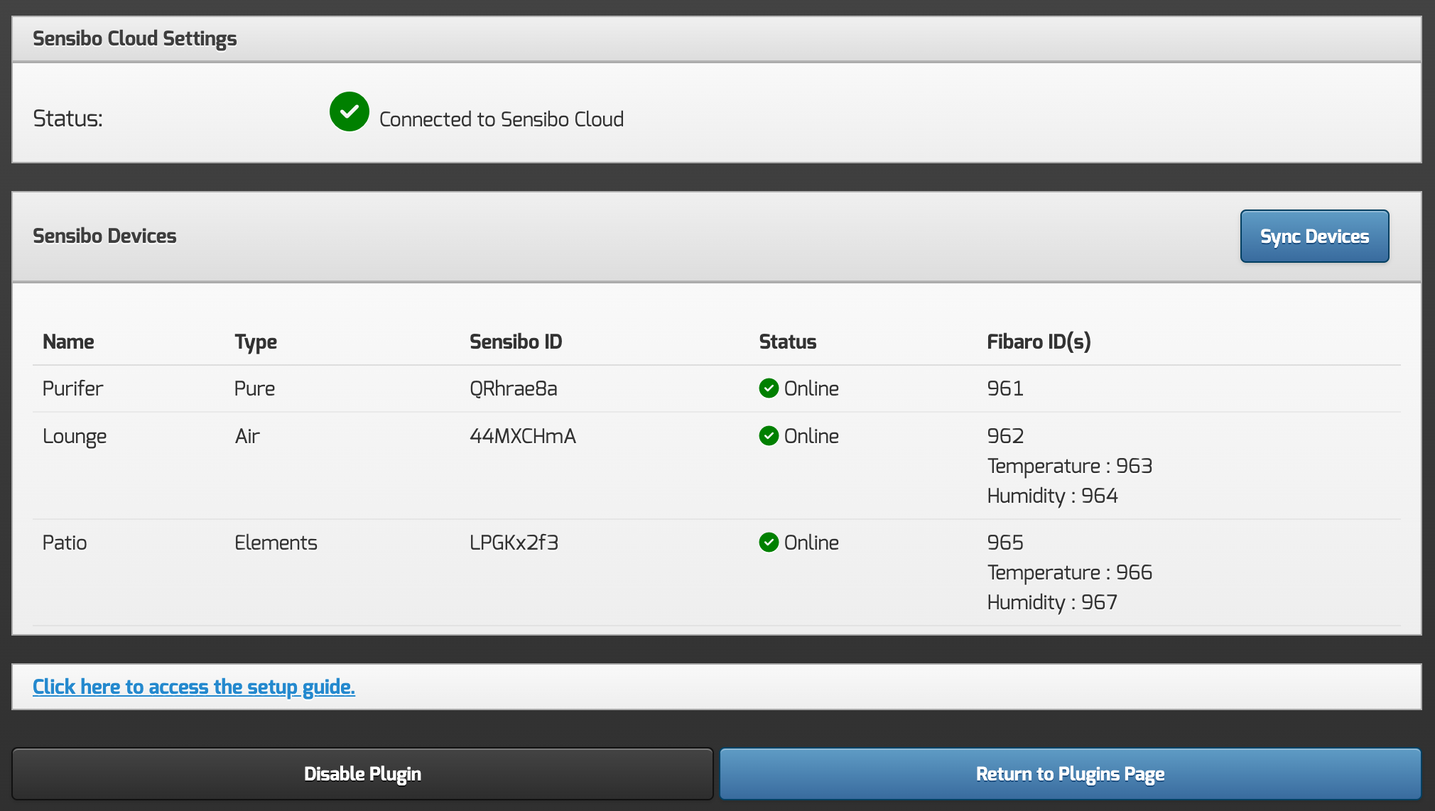 Click OK and you will then be taken to the Settings page for this plugin, from here you can re-sync to pickup any name changes in the Sensibo devices.
