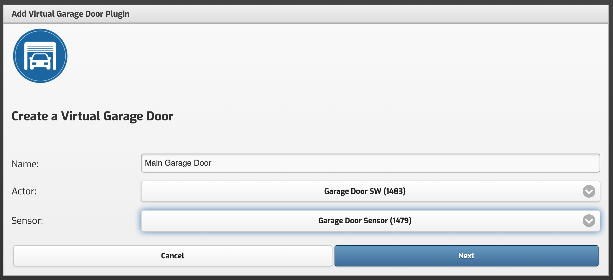Step 2 - Select the Actor device (this is the switch object that is connected to the garage door opener), and then select the Sensor object (this is what tells the system what the current door state is)