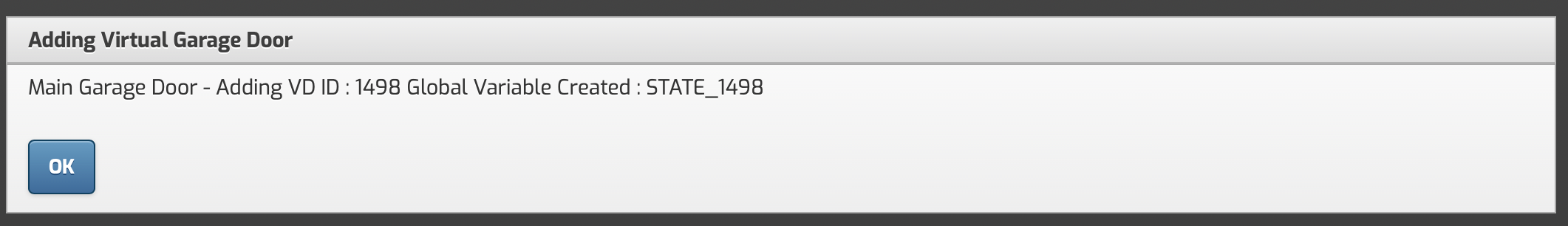 Step 3 - Click Next and the Virtual GD will be created, you will be given a confirmation screen, showing the ID number of the device created in your Fibaro Controller, along with the global variable that can be used.
