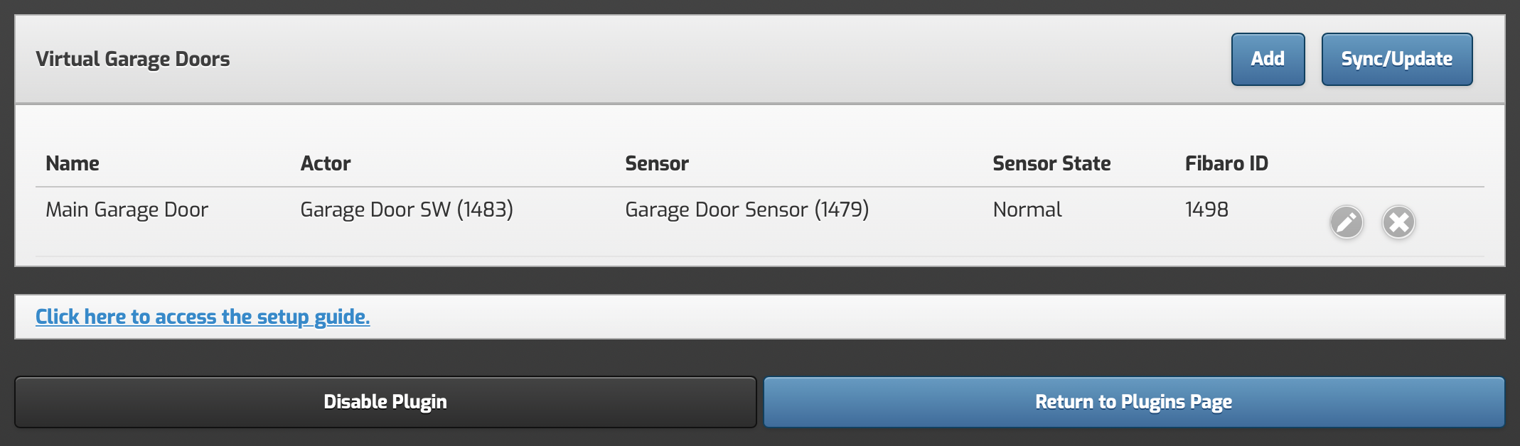 Click OK and you will be taken to the Settings page for the Plugin. From here you can add/remove Garage Doors and edit their configuration. If your sensor shows the incorrect state, ie OPEN when CLOSED, just edit the Door, and enable the Swap Sensor State setting.
