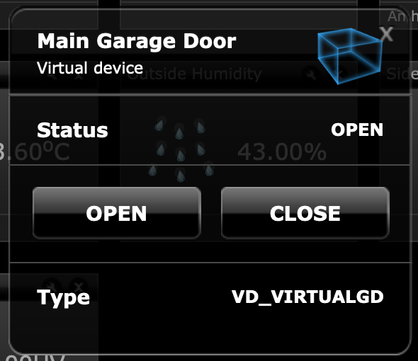 If you are using the Fibaro HC2/HCL controller, you will find the VD that has been created, this contains the status of the Garage Door, along with the action buttons to OPEN & CLOSE.