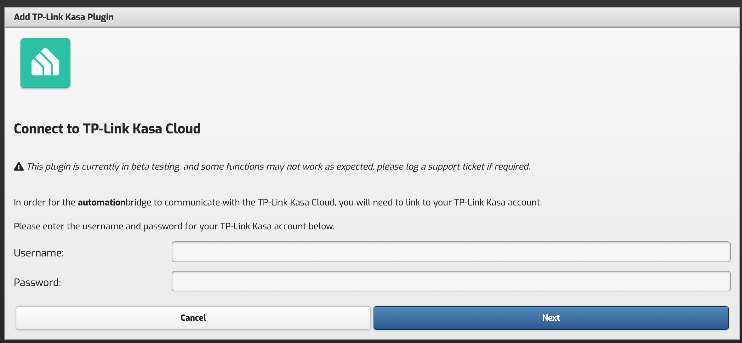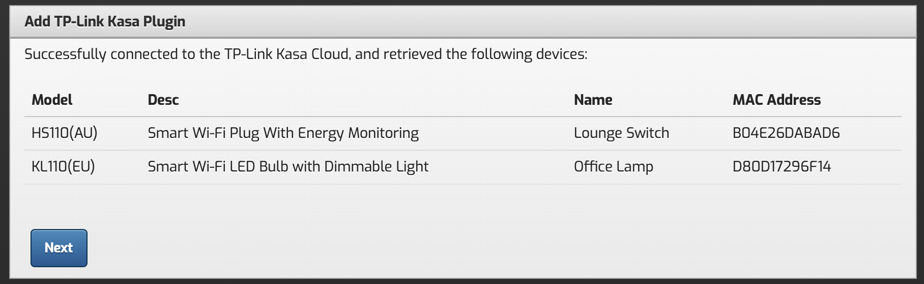 Step 3 - The automationbridge will then connect to the TP-Link Kasa cloud and retrieve the list of available devices.