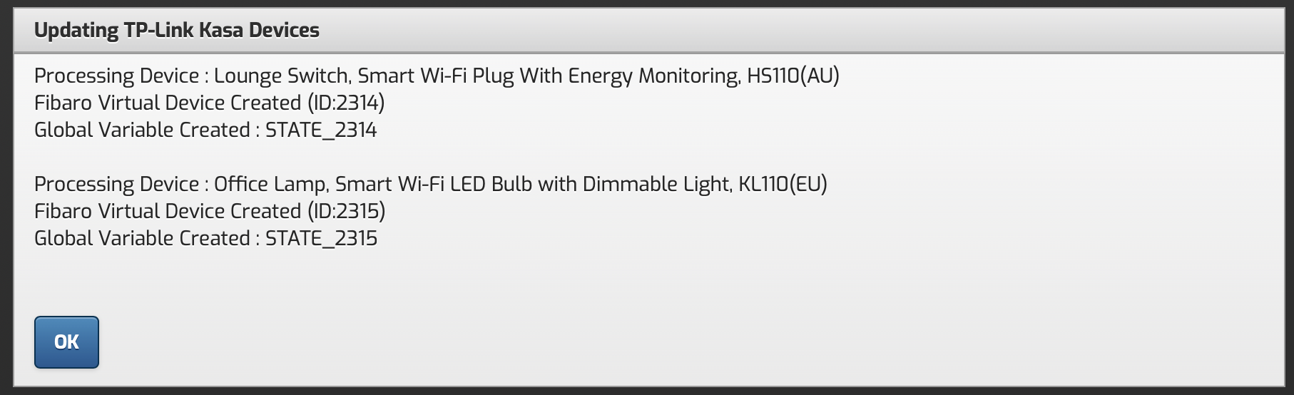 If you are running a Fibaro HCL/HC2 controller, you will now find that there are Virtual Devices for each of your Kasa devices, the power button will toggle the current