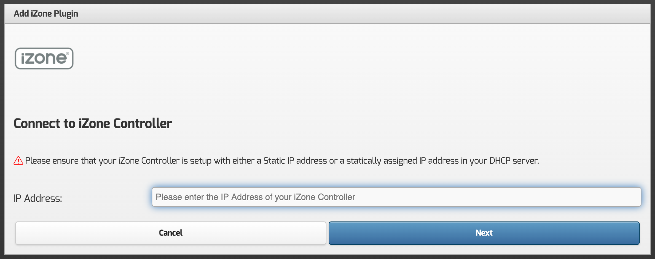 Step 2 - Enter the IP address of the iZone controller, and then click next.