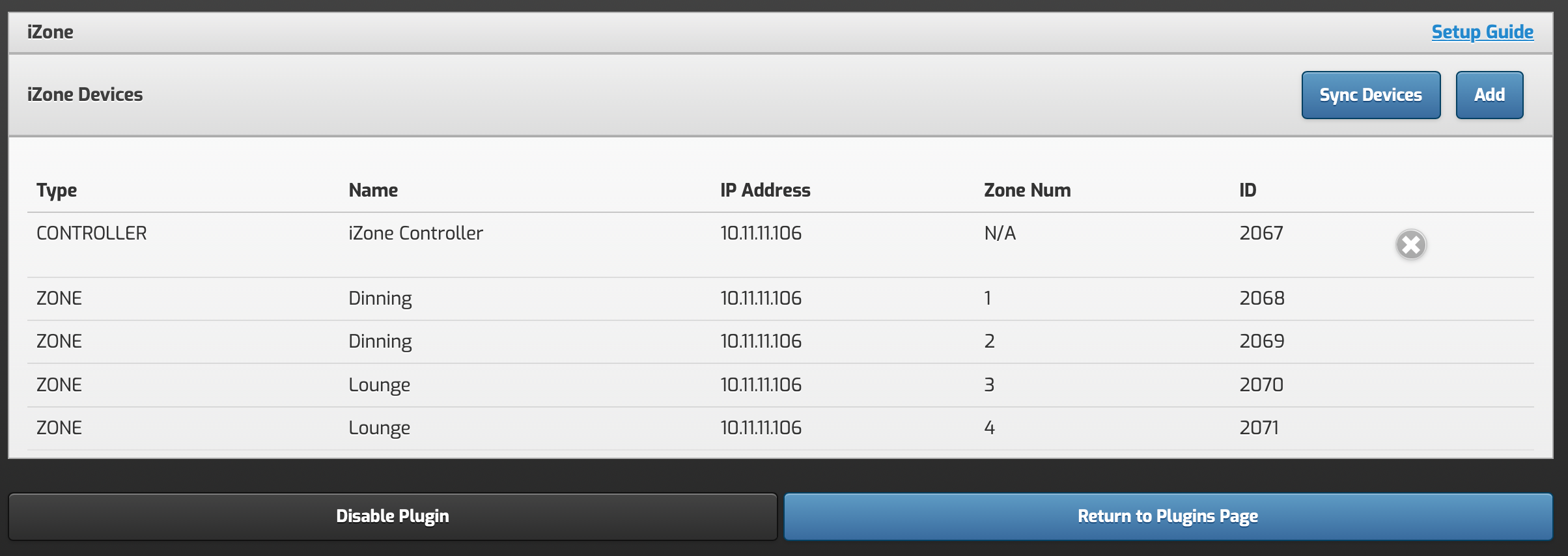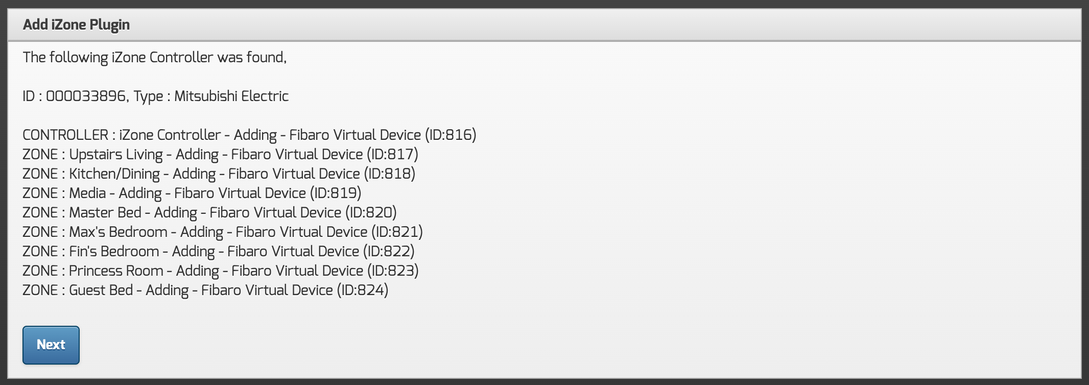 Step 4 - Click Next and the Fibaro devices will be created, and you will be taken to the Settings page for the plugin. Here you can perform a Sync, to update the Zone names if changed, and to also add additional controllers.