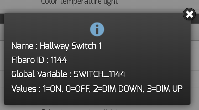 #2 A Global Variable will be created for each switch device, these can be referenced on the main Hue plugin page, by click the blue info icon beside the Fibaro ID number.