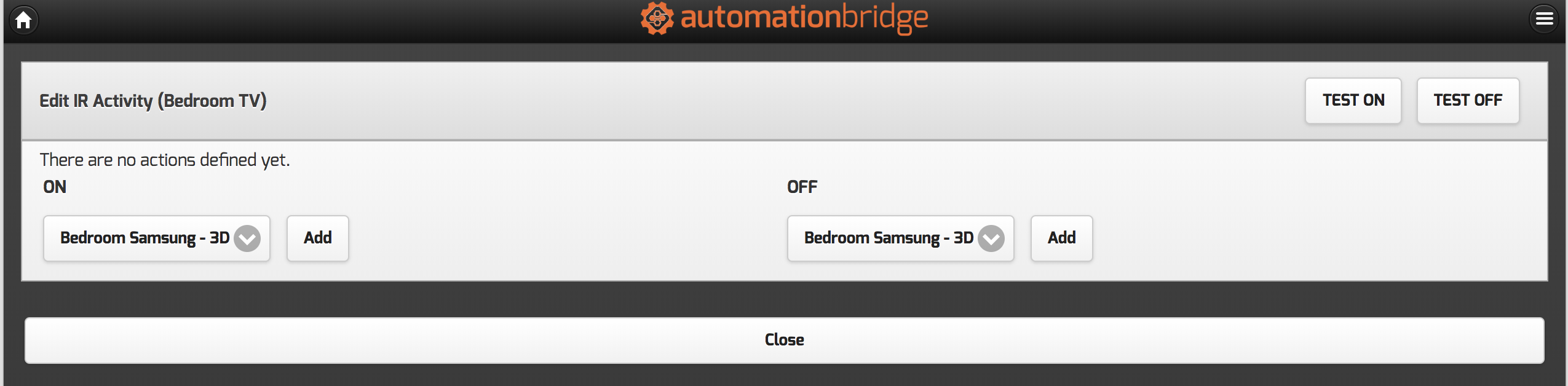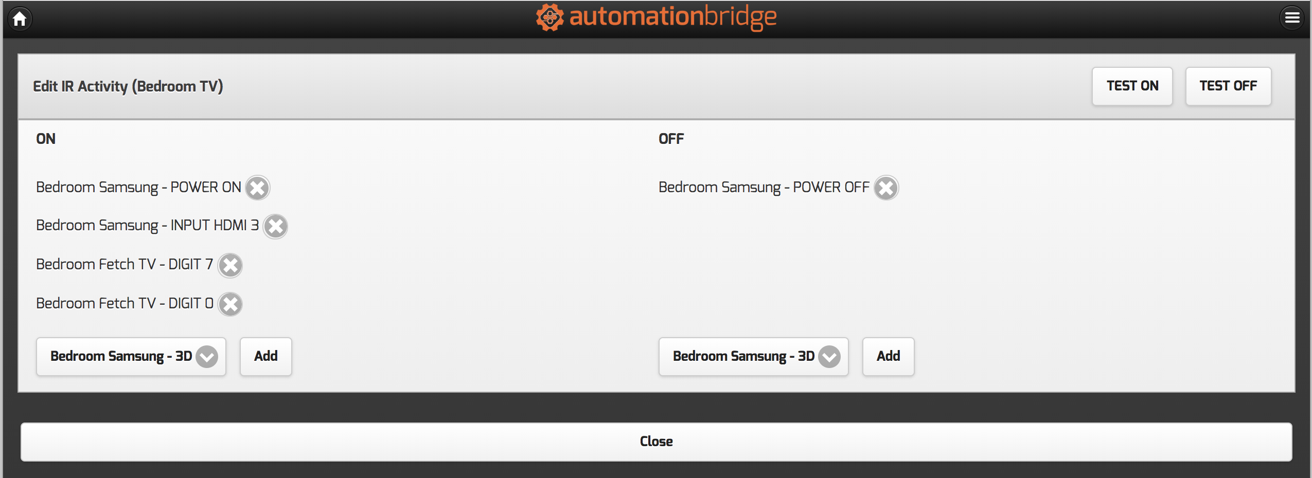 In this example, we have defined the ON action as turning on the TV, changing the Input to HDMI 3 and then setting the channel on the Fetch TV to 70.