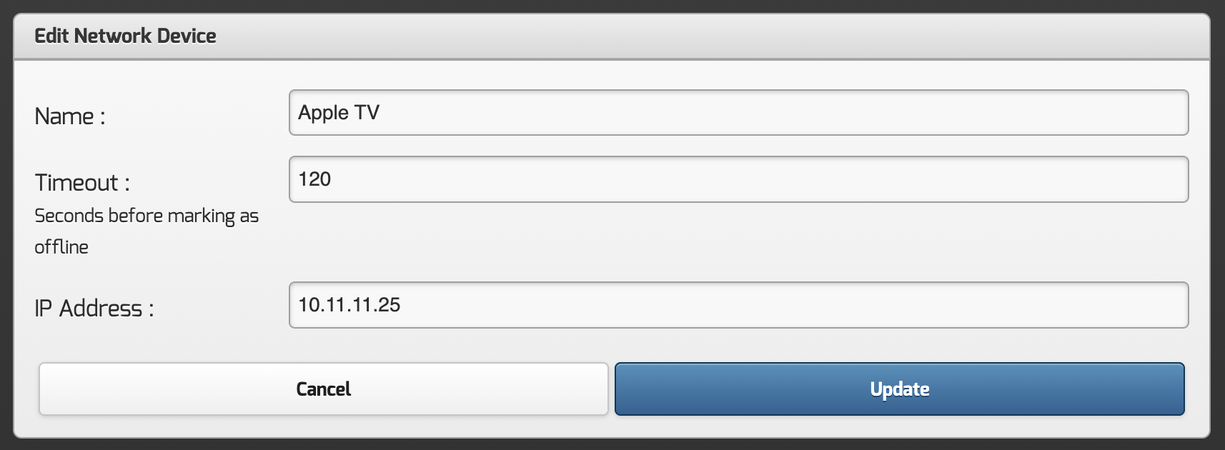 Editing a device : Timeout is the number of seconds after which it remains offline to be treated as such.