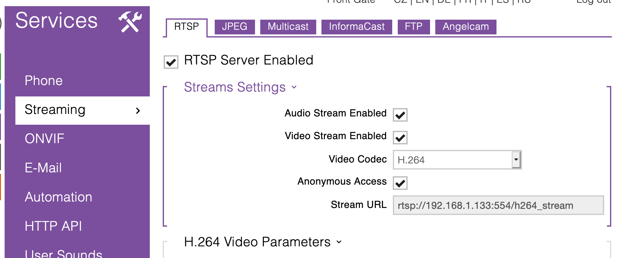 - Under the Services/Streaming page, enable RTSP server, and set to H.264 and Anonymous Access.