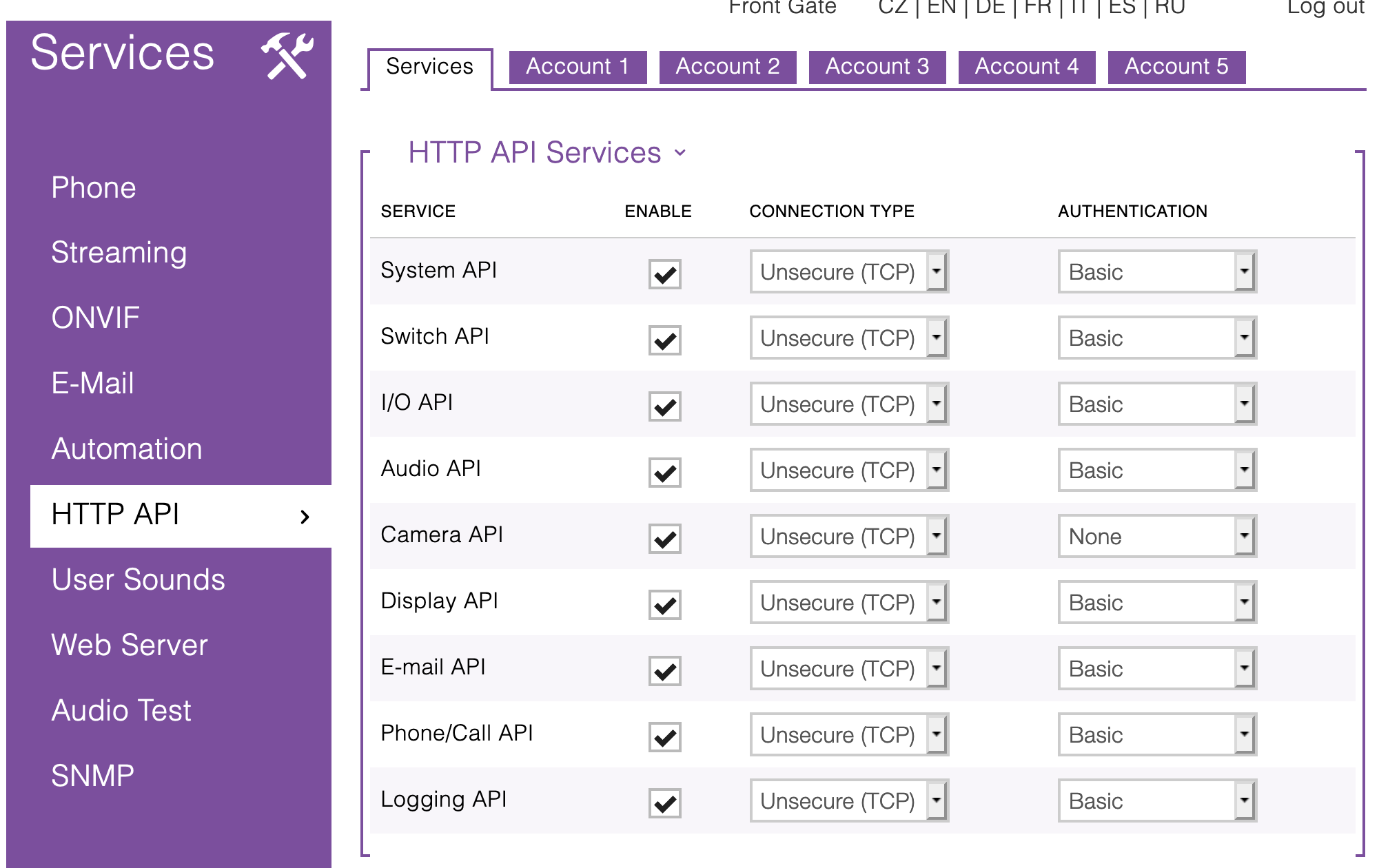 - Under the Services/HTTP API page, set Authentication for all except Camera API to Basic.