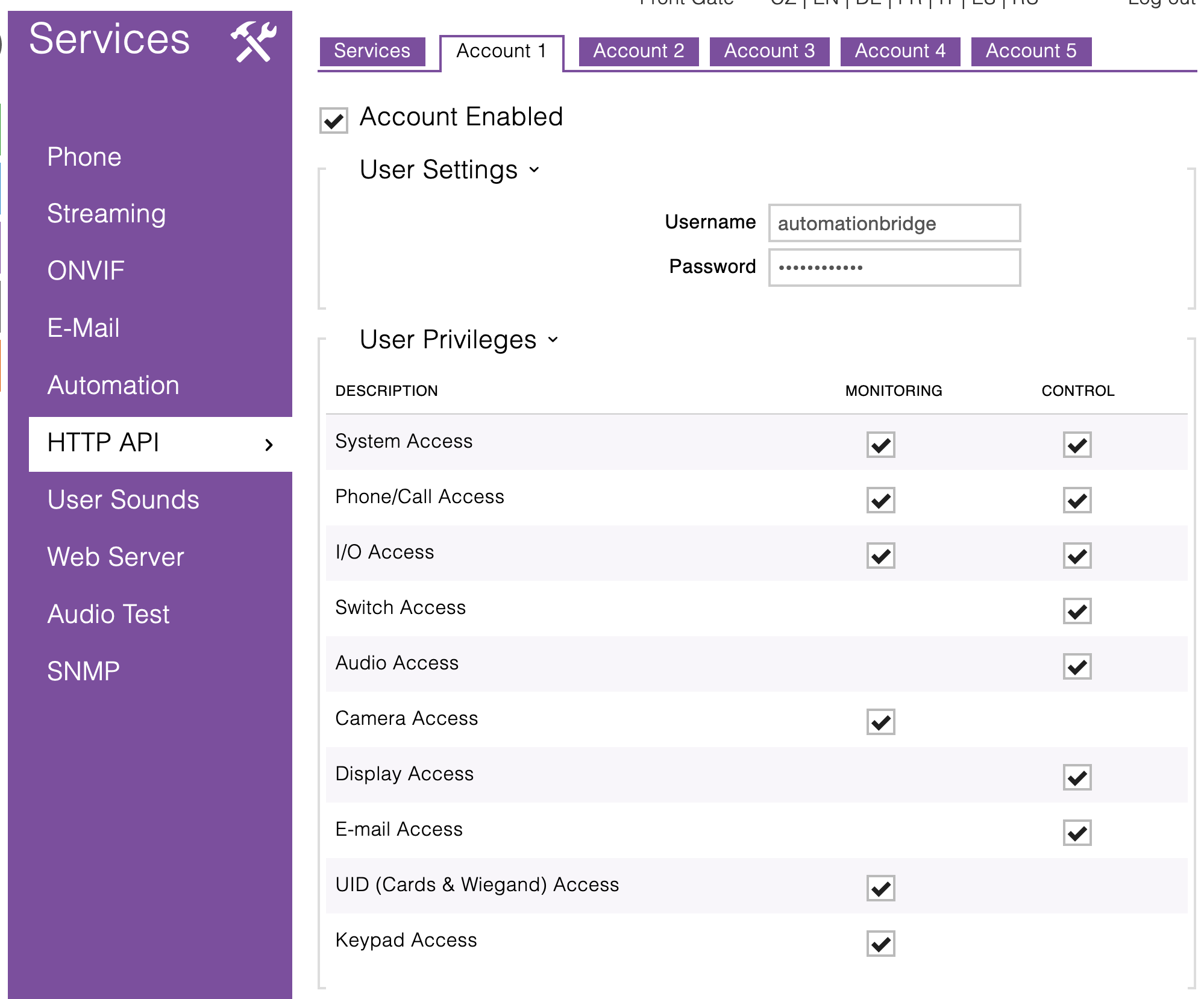 - Under the Services/HTTP API page, Create an account for the automationbridge on one of the Account 1-5 tabs, with all permissions as shown below.