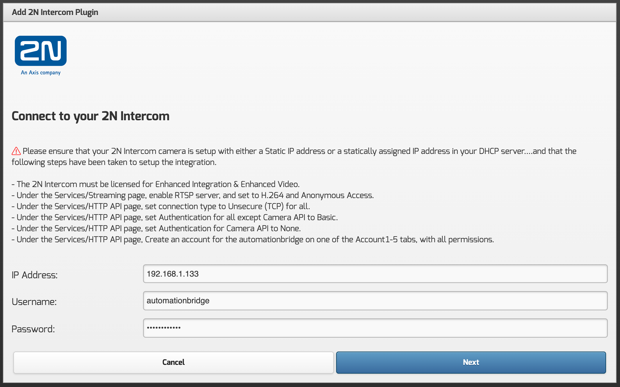 Step 2 - Enter the connection details for the Intercom (please note that the details shown below are an example only, your's will be different), then click Next.