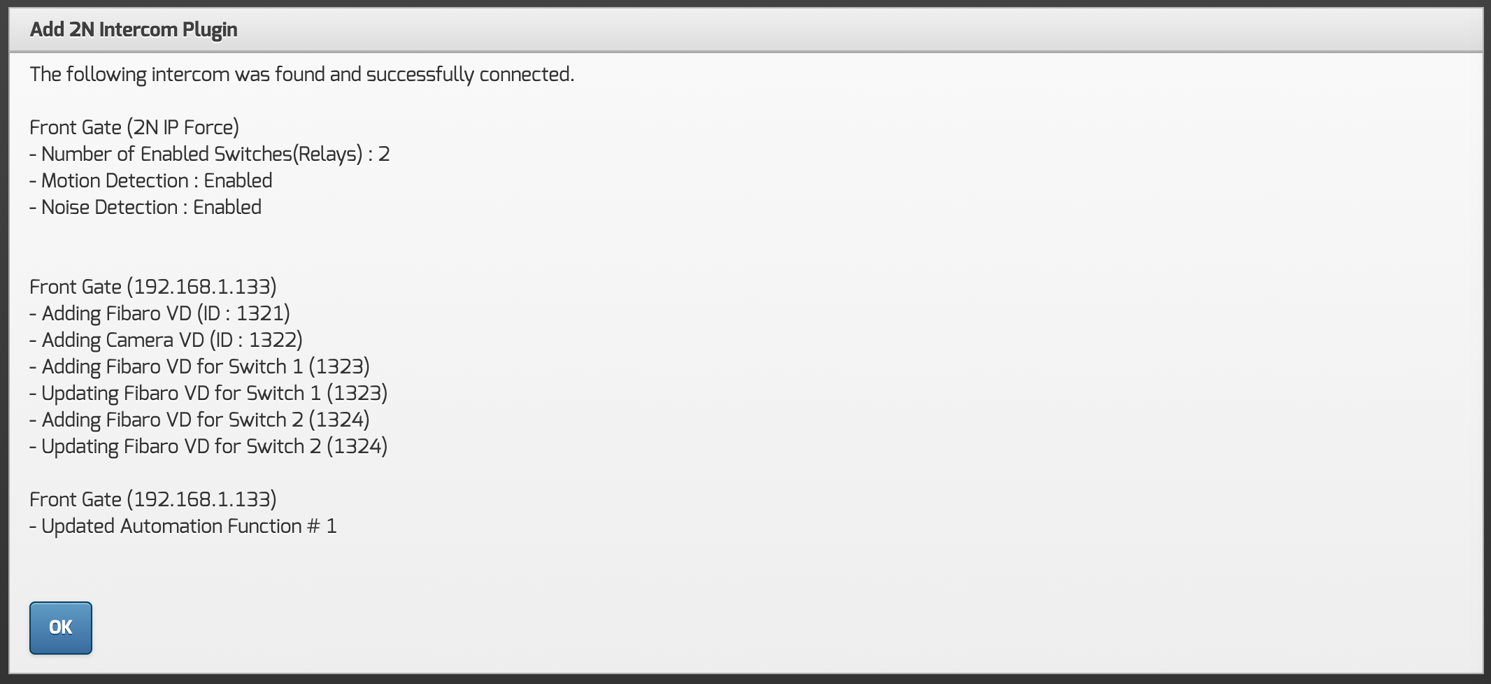 Step 3 - The automationbridge will then connect to your intercom, verify the settings, and if all correct the Fibaro Devices will be created, and the 2N Intercom updated with the required automations.