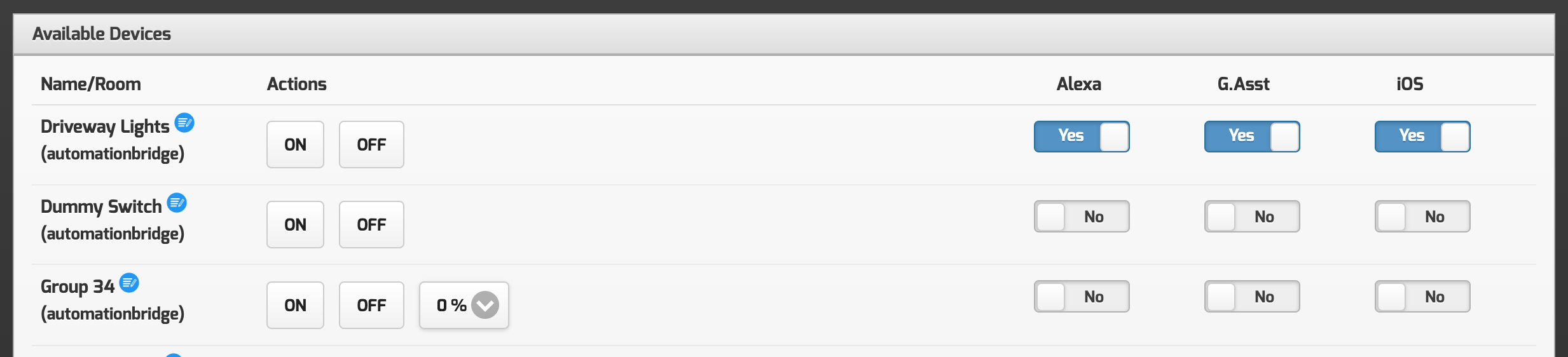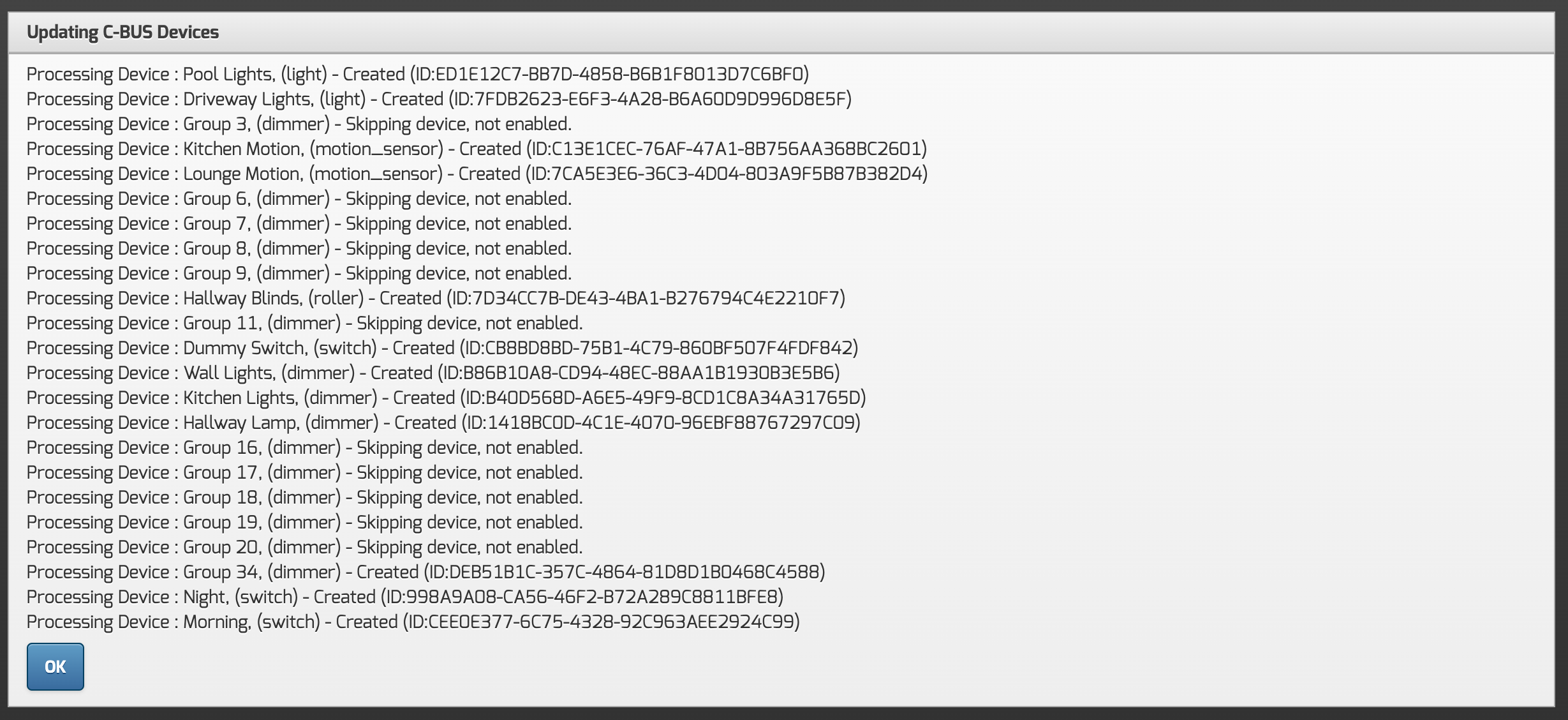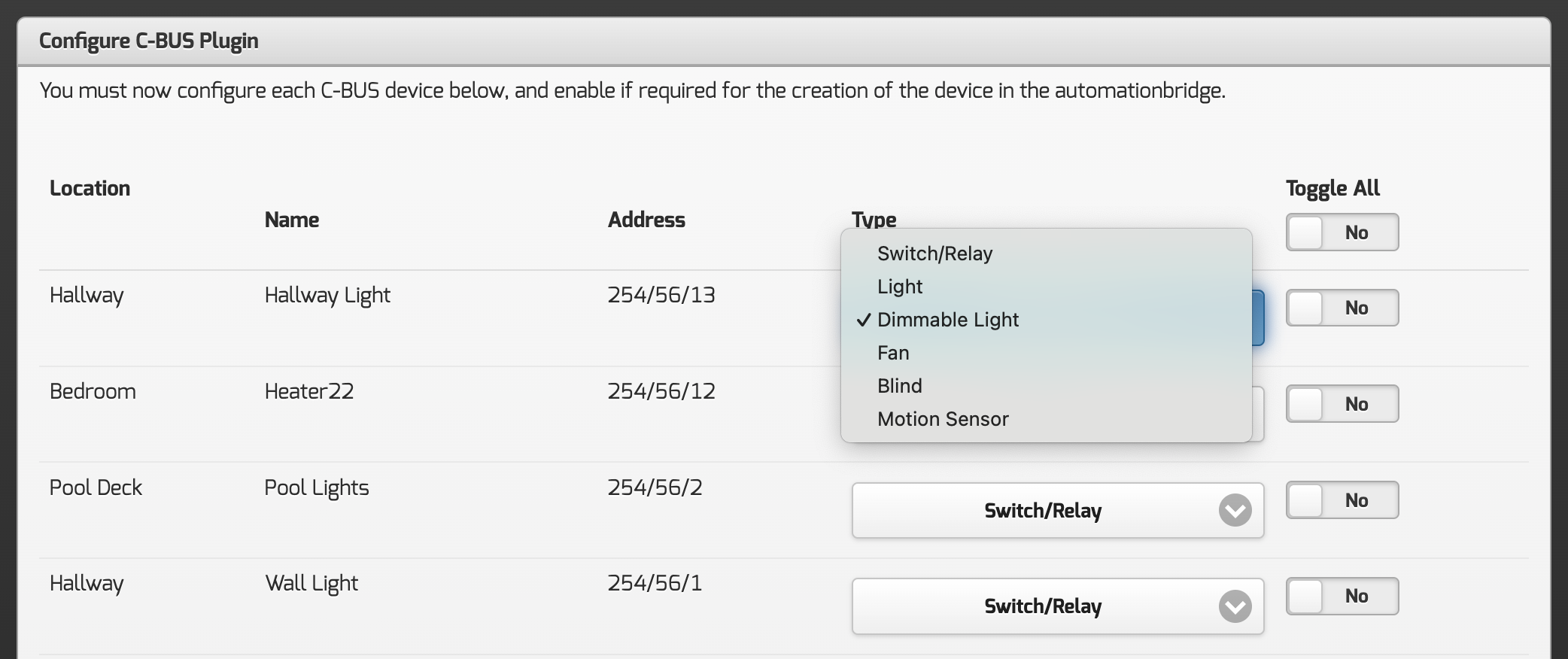 This completes the C-BUS setup, now you can navigate back to the home page of the automationbridge, and enable as required for each device and smart home integration.