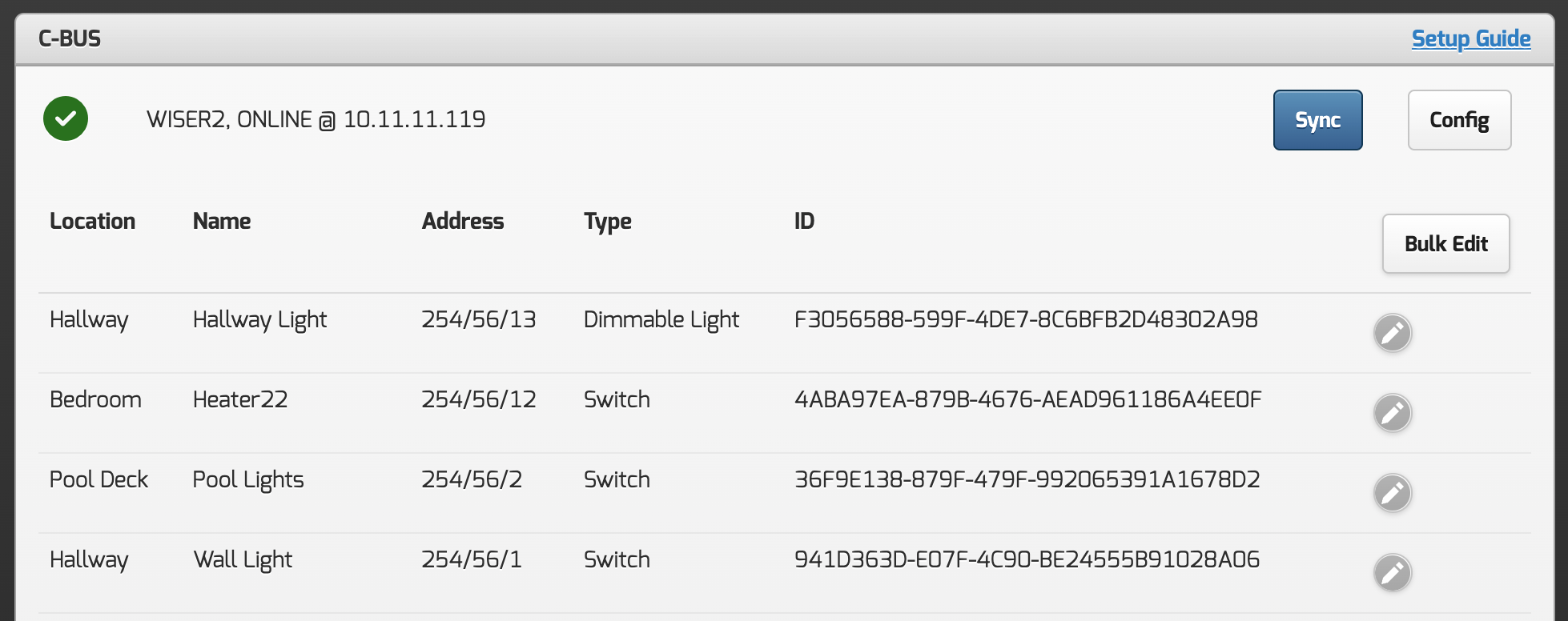 Click Ok to complete the setup, and you will be taken to the plugin settings page, from here you can edit the devices if required to adjust their type, or if you have added/updated any devices in the C-BUS controller, you can perform a Sync to update. You can also return to the Bulk Edit page to edit all devices at once.