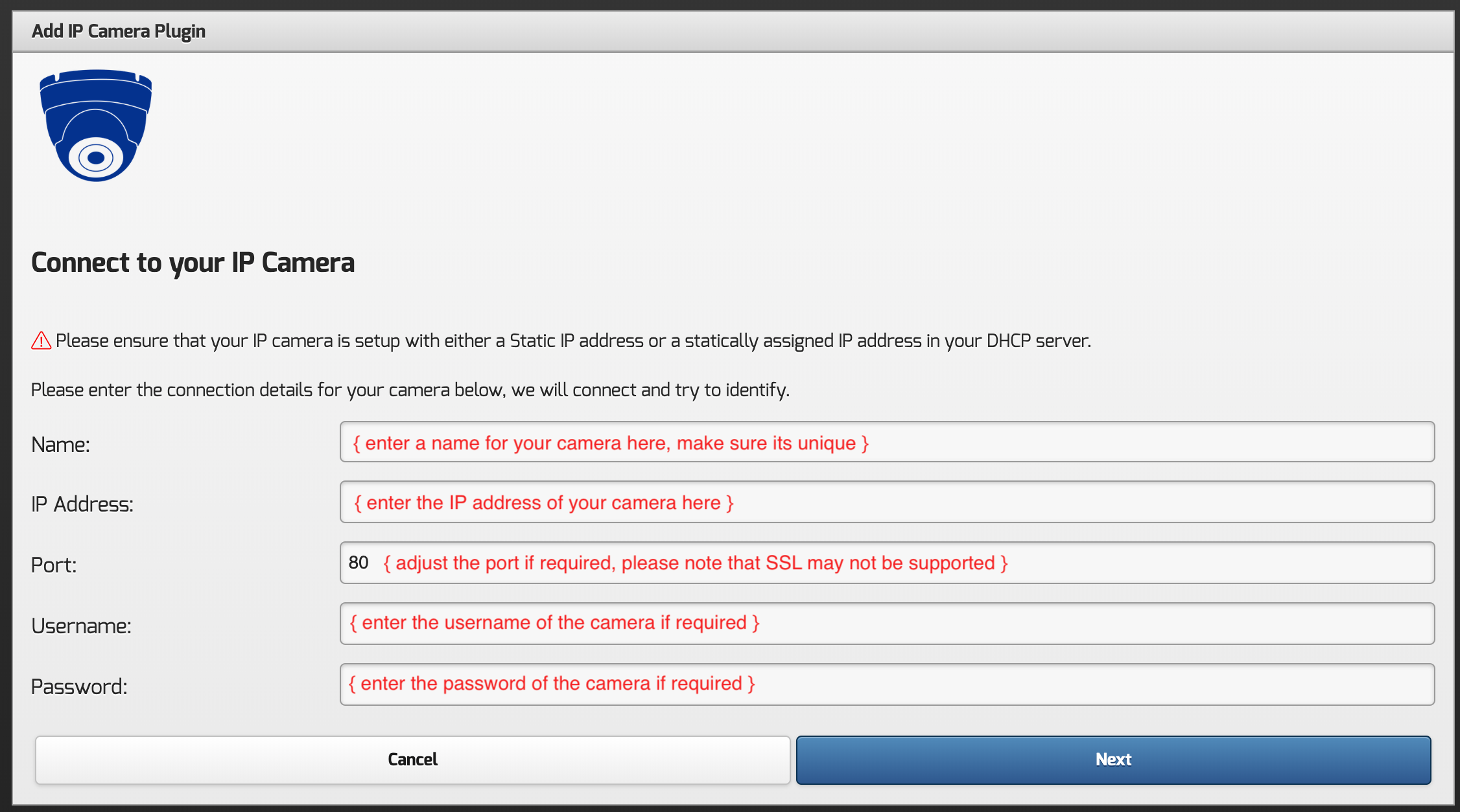 This guide assumes that you have already setup your IP camera on the network, it must also be assigned a static IP address, you can do this either manually on the camera, or via your DHCP server as a static reservation.