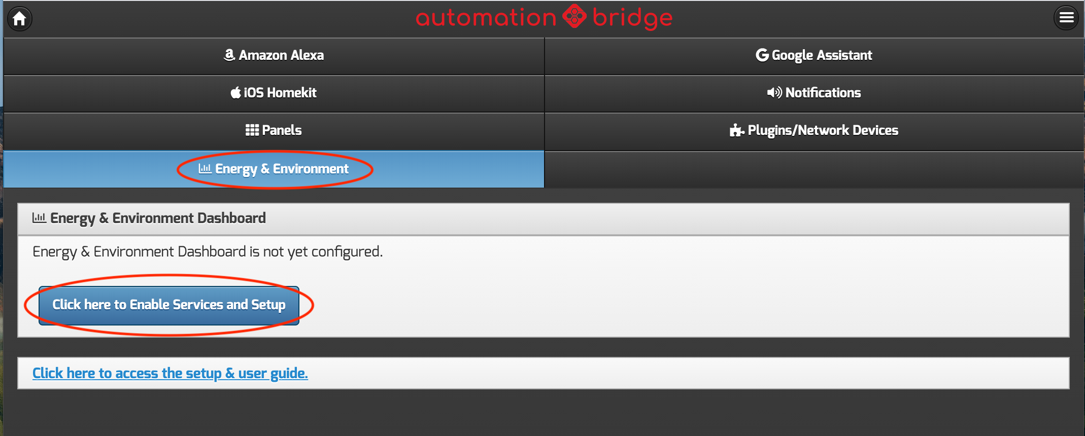 Step 1 - To get started, navigate to the Energy & Environment tab on the automationbridge PRO interface, and click the button to enable the required services and setup.