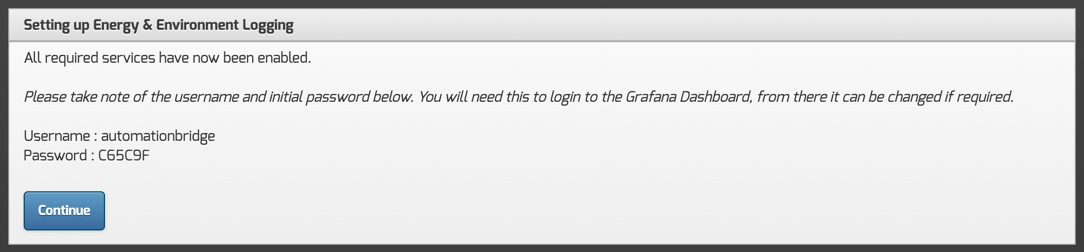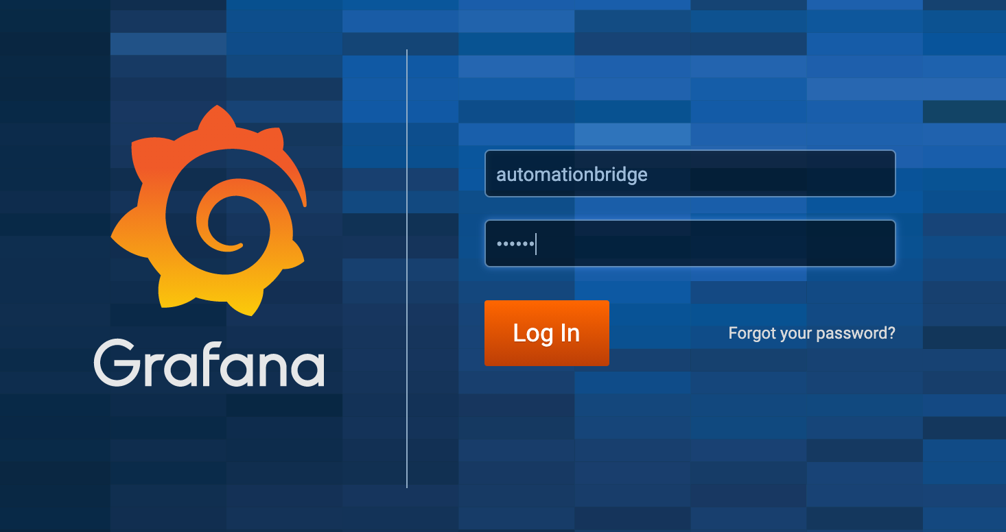 You will then be presented with the Grafana login page, enter the username of automationbridge and then the password that was given to you above in Step 2.