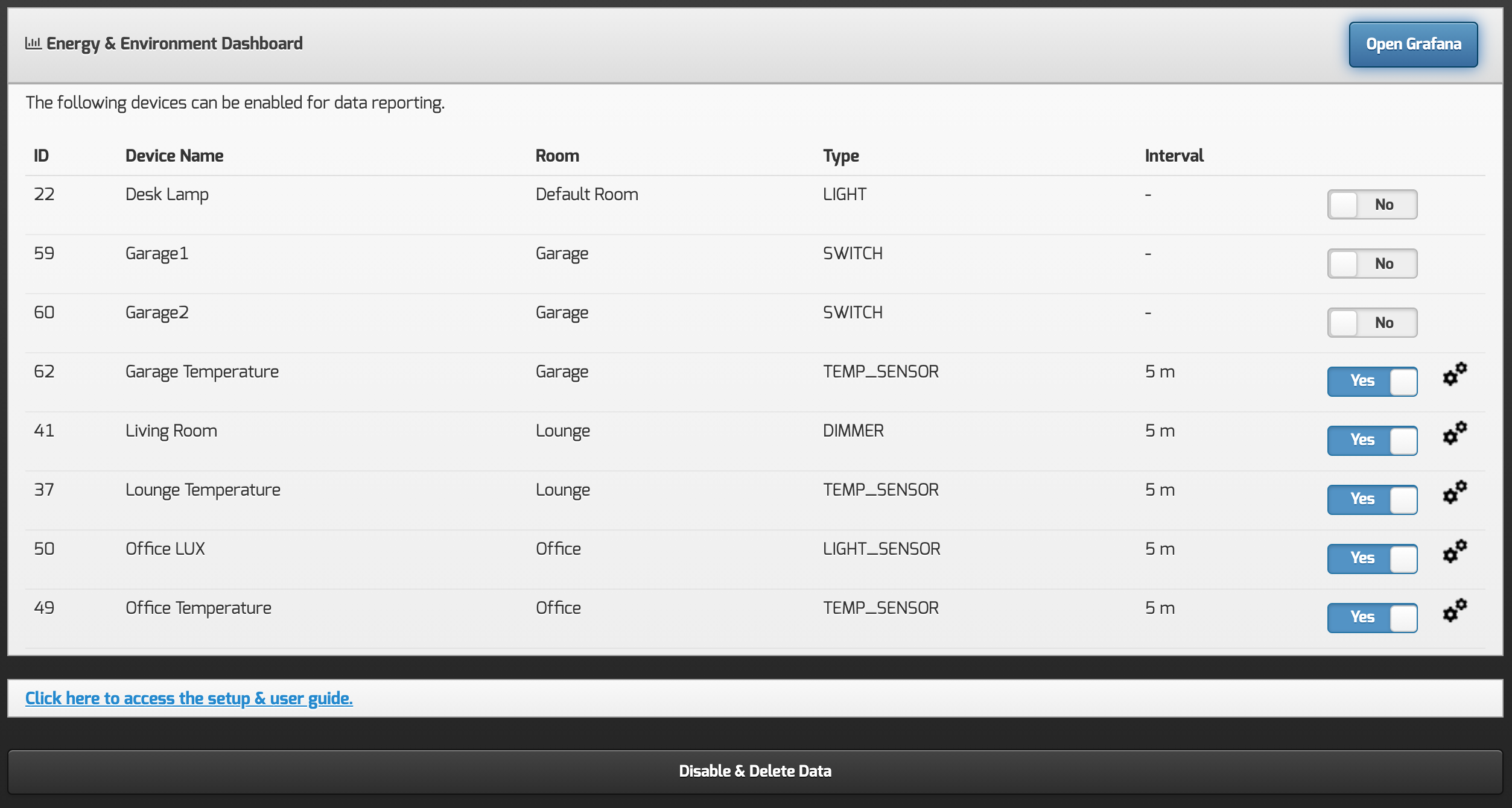 Once you have enabled all the required devices, leave for approx 5 minutes, this will ensure that there will be some initial data to proceed with the next steps of creating your dashboards in Grafana.