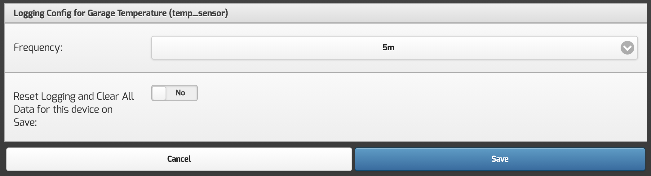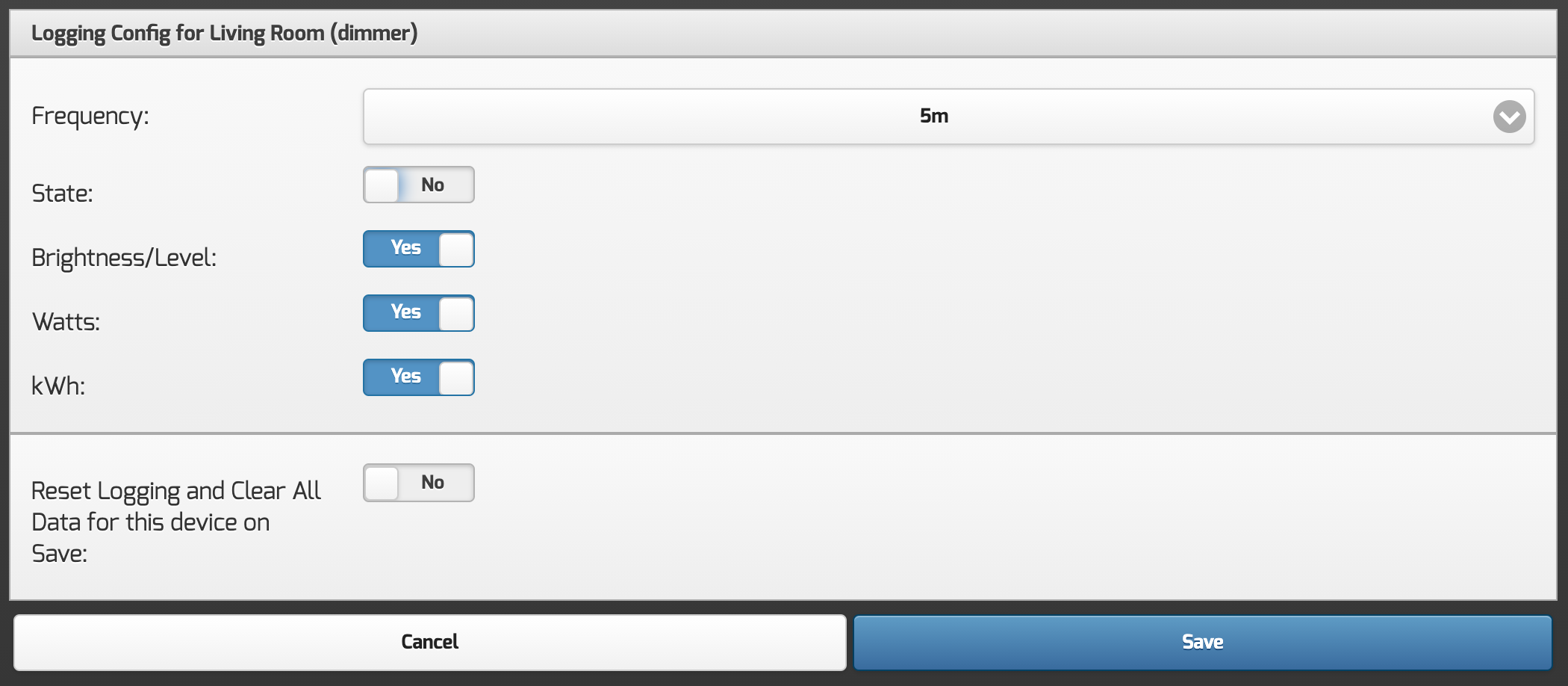 To enable the logging and reporting for a device, just click the slider on the right to enable, you will then be taken to the config page for this device, where you can adjust the values that are logged, and also the frequency.