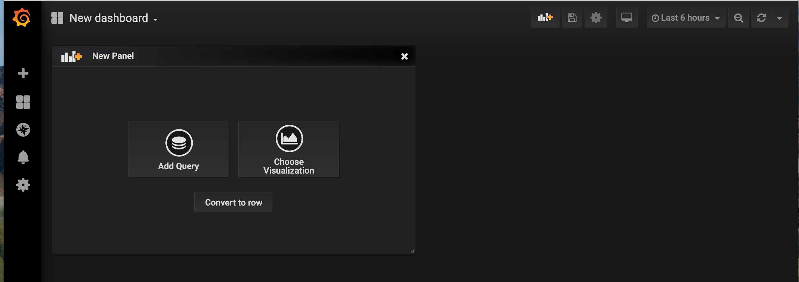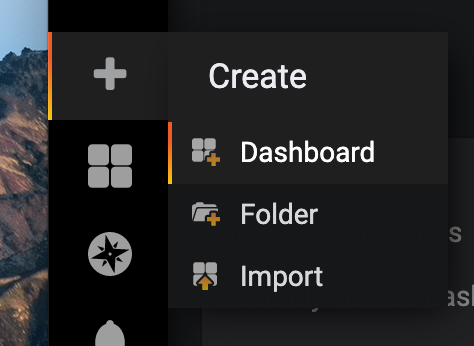 Once logged in, you will be presented with an empty dashboard, start by creating your first dashboard by clicking on the + icon on the left hand menu, then choosing Dashboard.