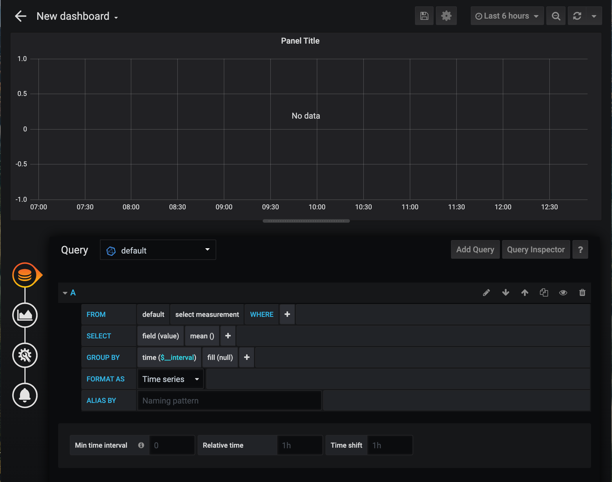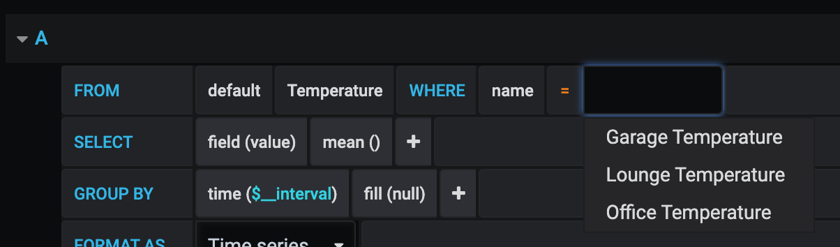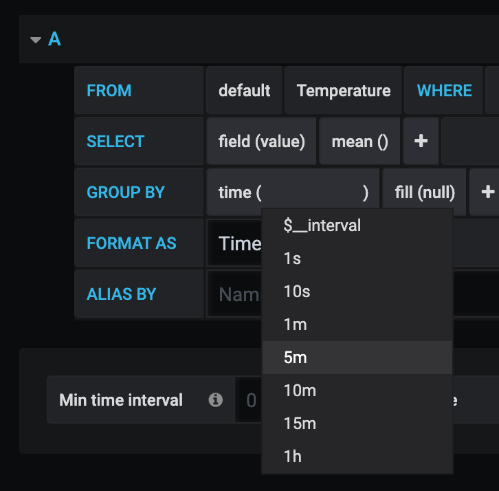 Next we need to adjust the display interval, to match that of the automationbridge data logging, this is so the graphs are displayed in a nicer format, to do this just click the time($_interval) field and change to either 1m or 5m