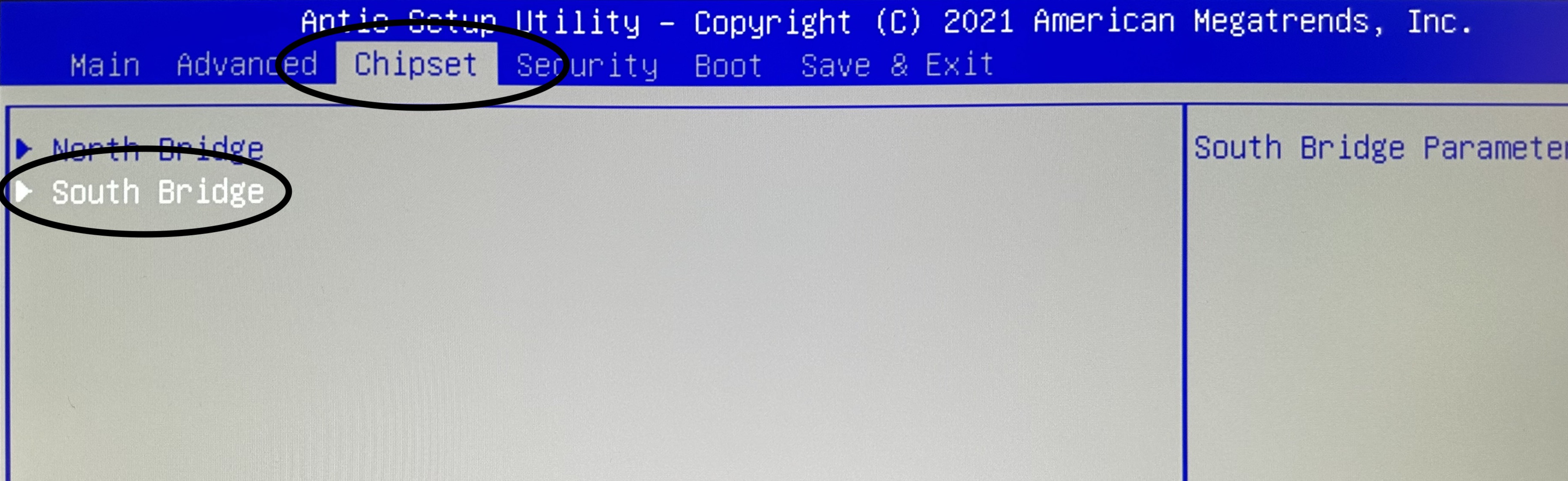 - Using the arrow keys, move to the Chipset menu, and then to the South Bridge menu and press Enter.