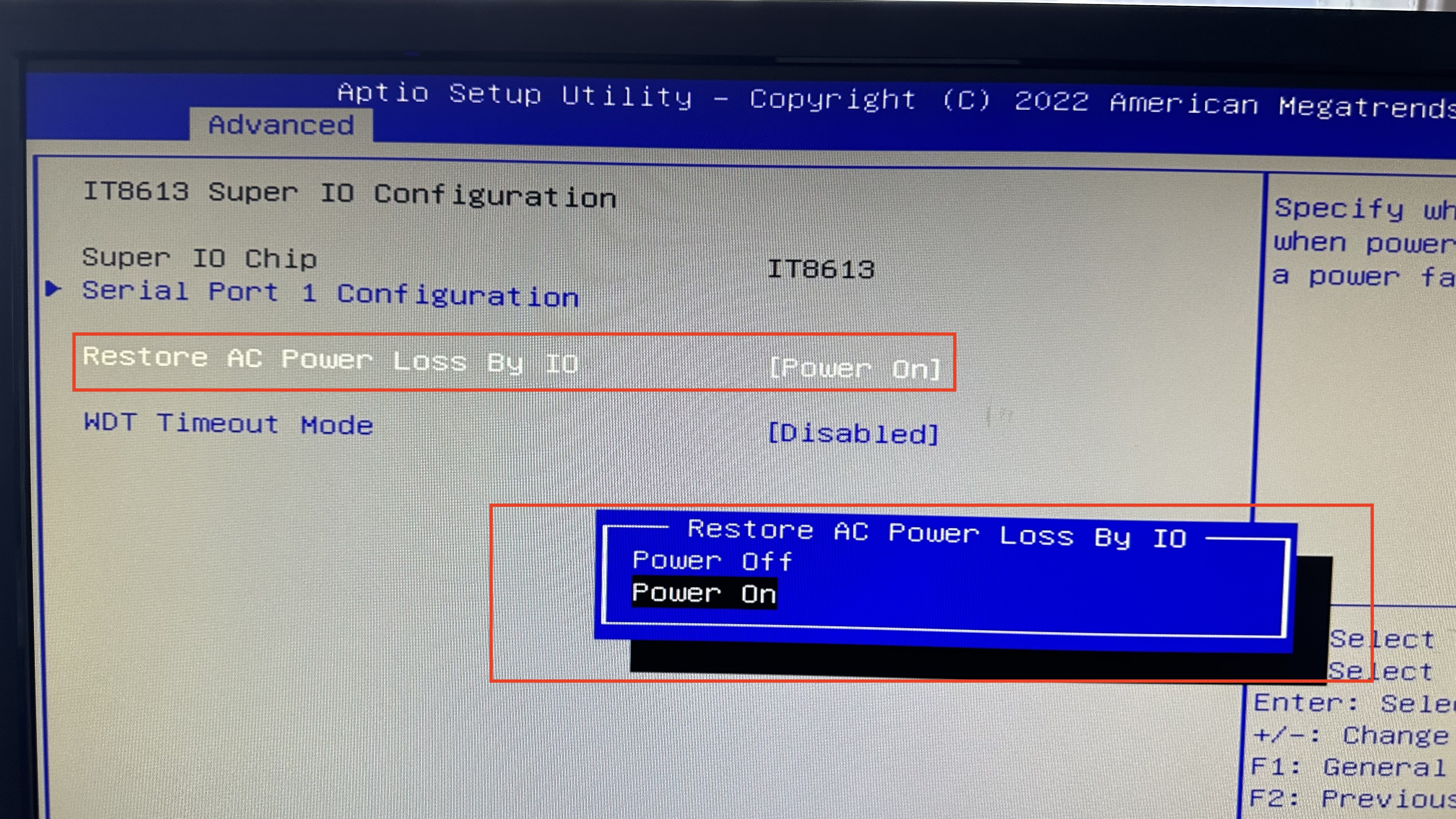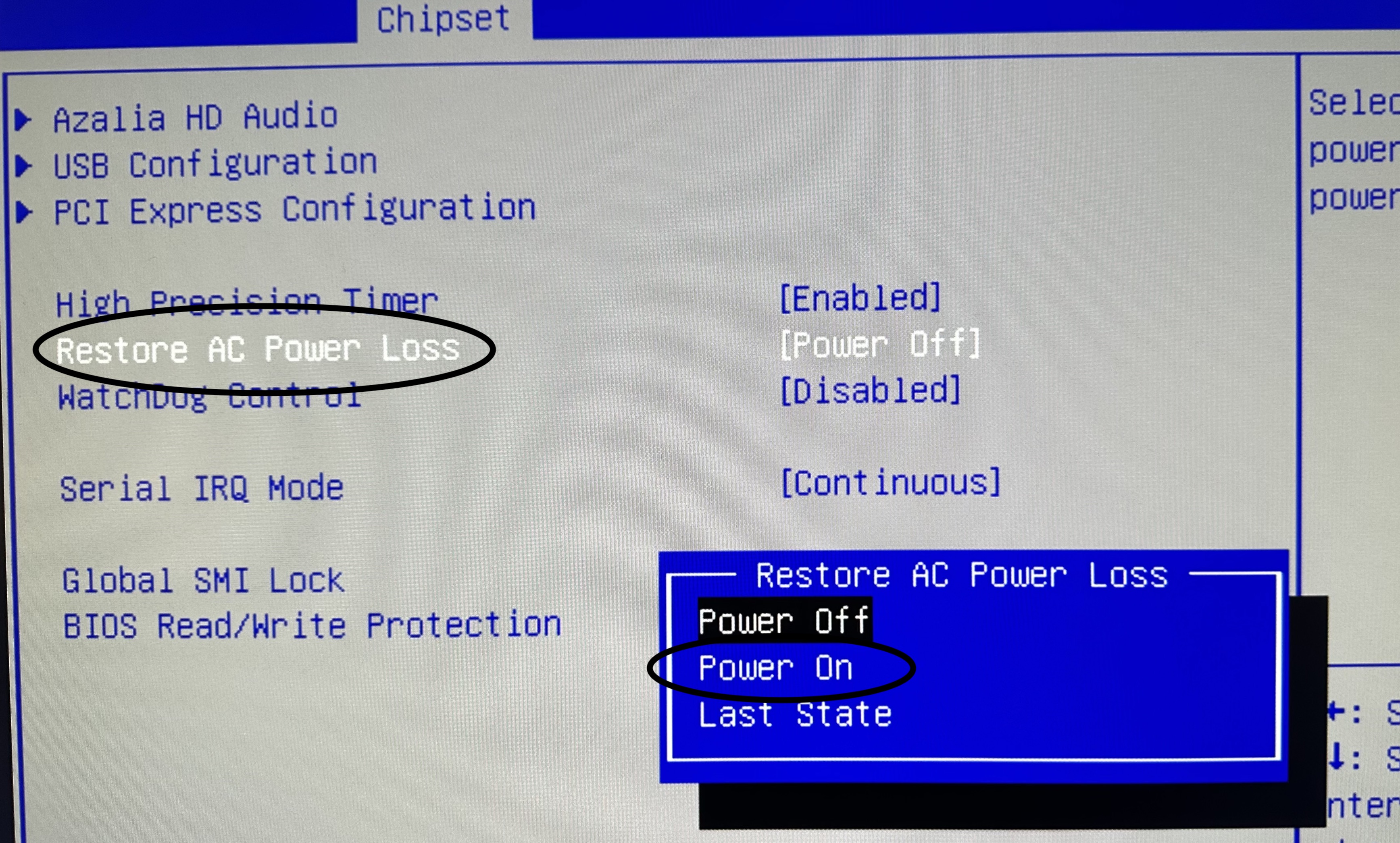 - Next navigate to the Restore AC Power Loss by IO option, and change this to be Power On