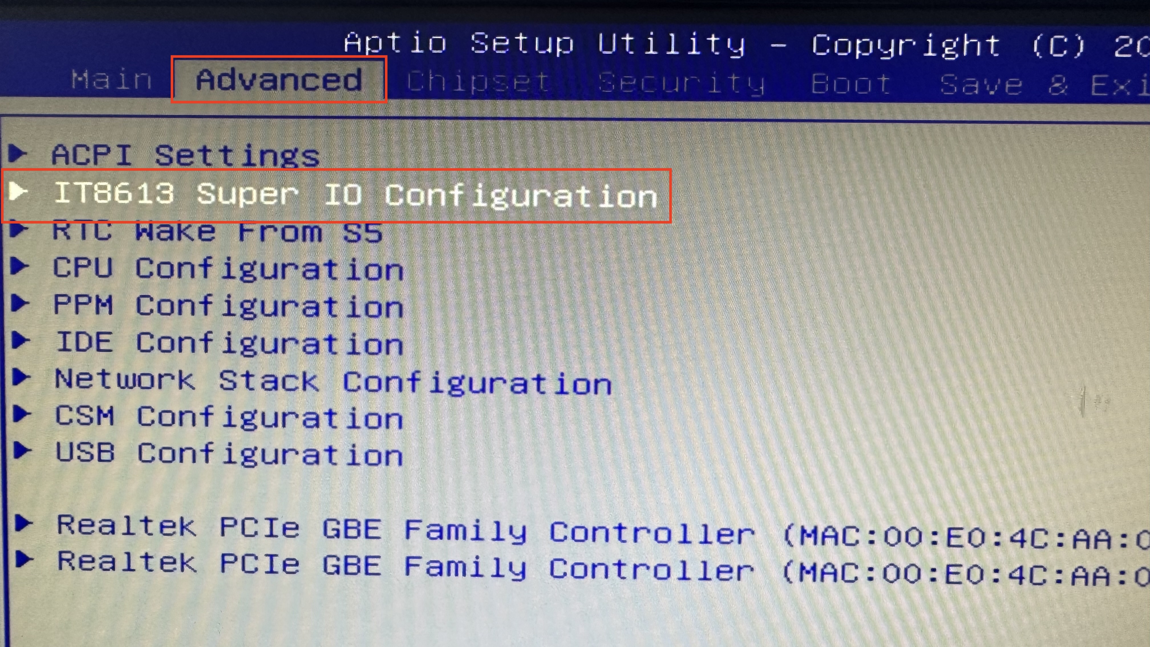 - Using the arrow keys,navigate to the Advanced menu, then choose, IT8613 Super IO Configuration