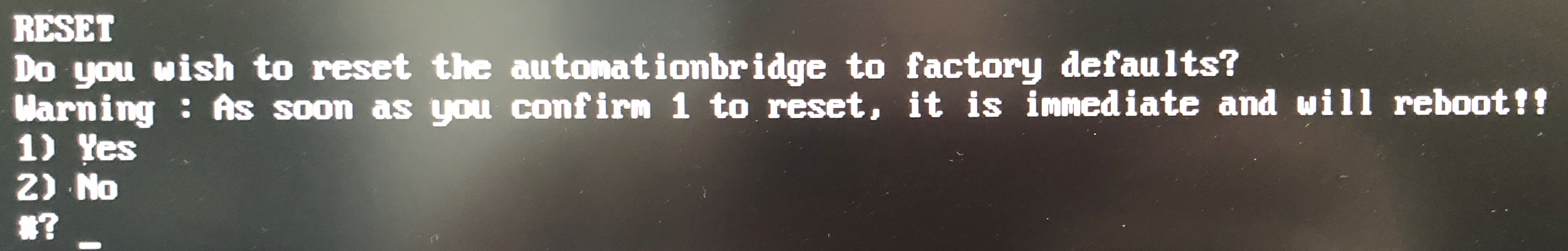Press 1 to reset the bridge to factory defaults, this will clear all existing settings for your controller, and set the bridge back to DHCP.