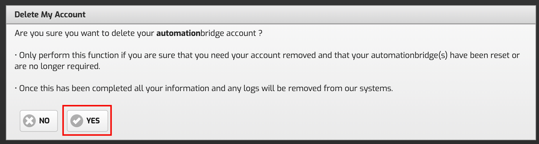 Step 3 - You will now be prompted to confirm the account deletion, click Yes to proceed.