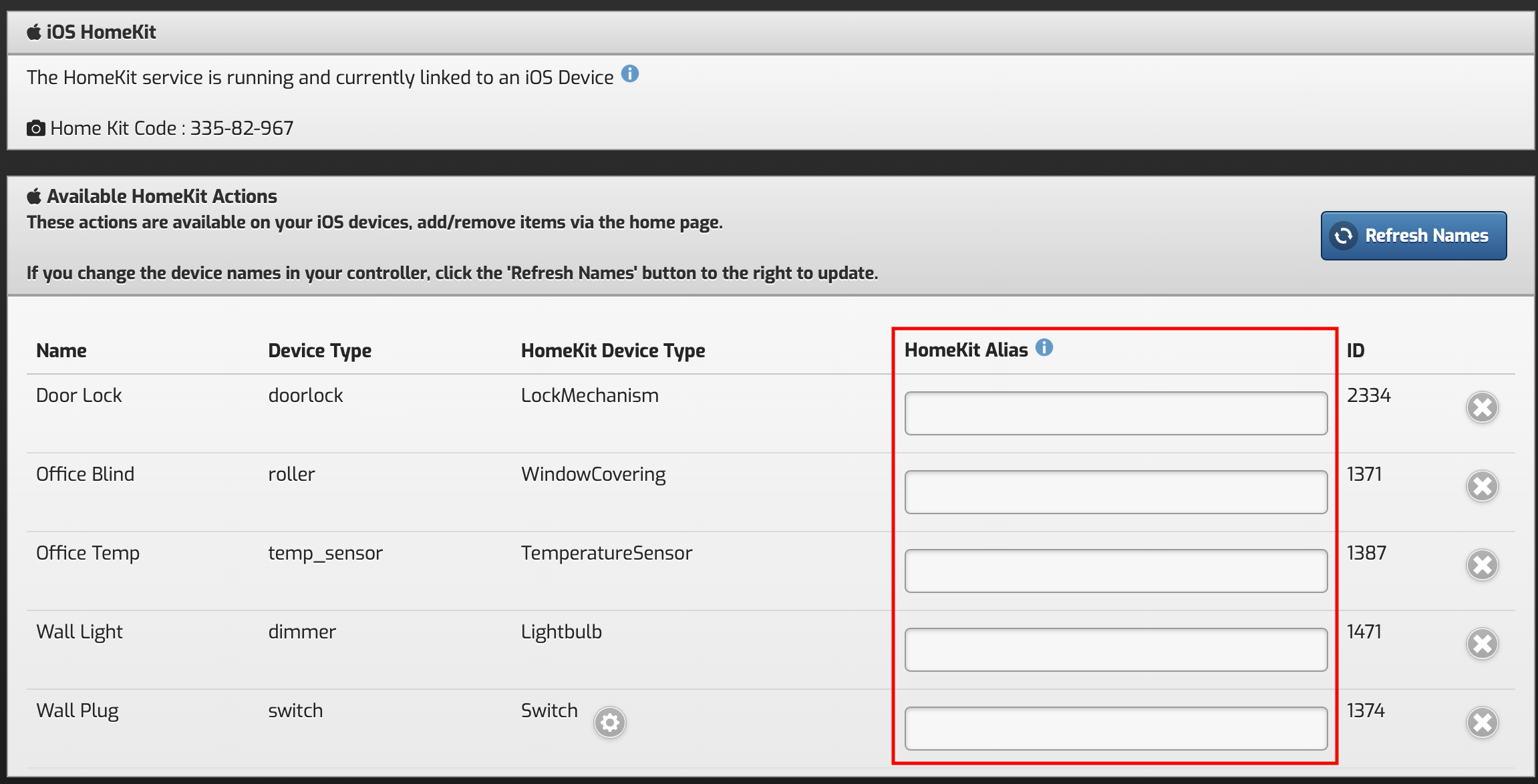 Navigate to the HomeKit page on the automationbridge, and you will find there is a new column for entering the Alias name, just enter a new name in the field, making sure to tab/click out of the field to ensure that the name is automatically updated.