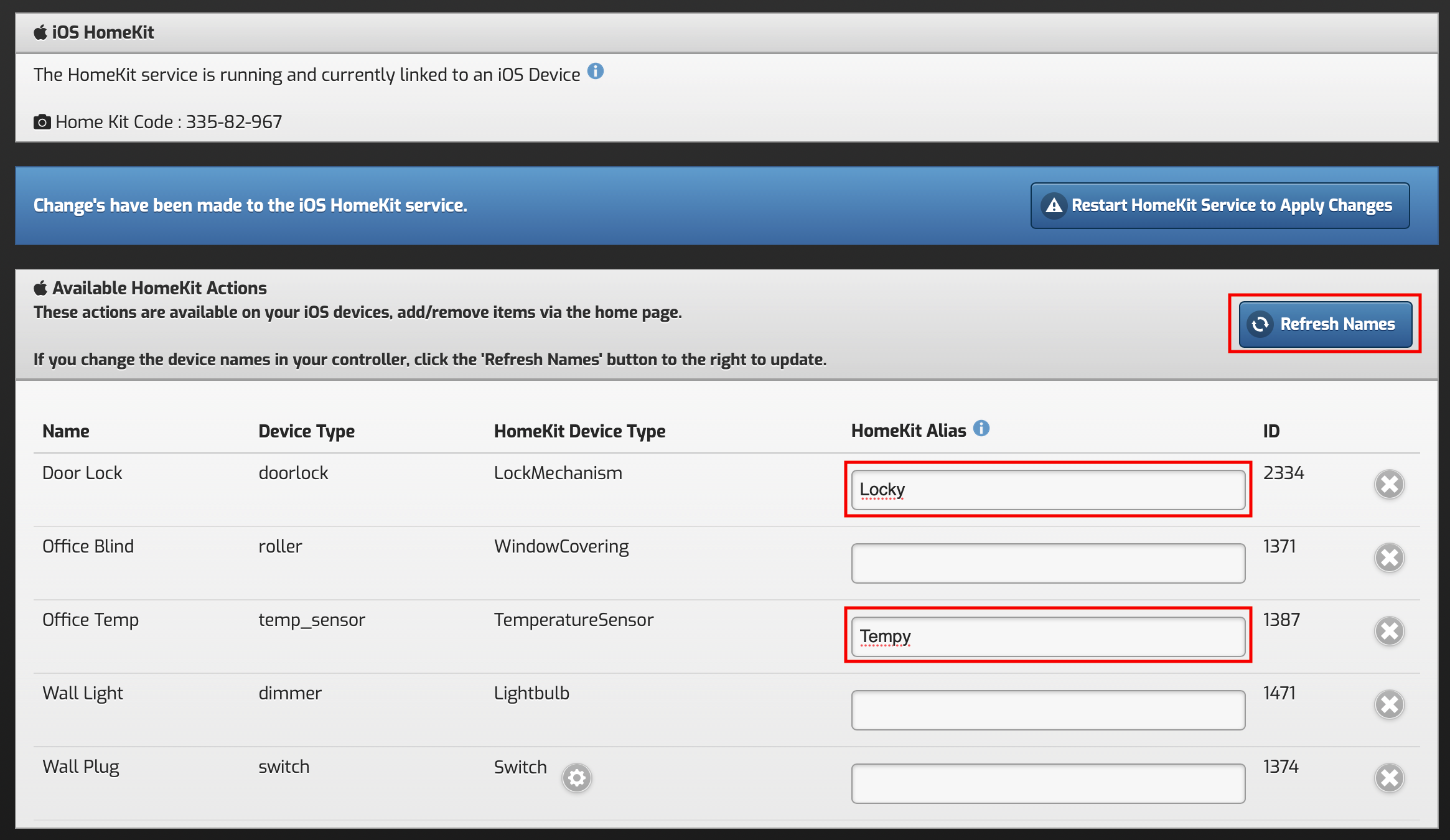Step 1 - Update some of the device names as needed, making sure to click the Restart HomeKit button when done.