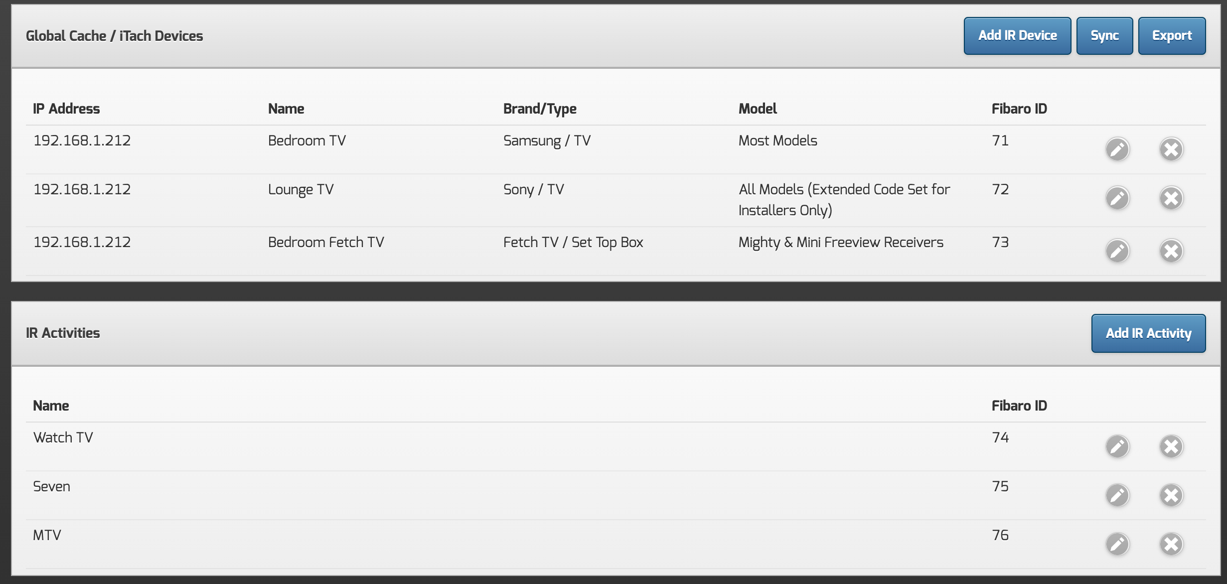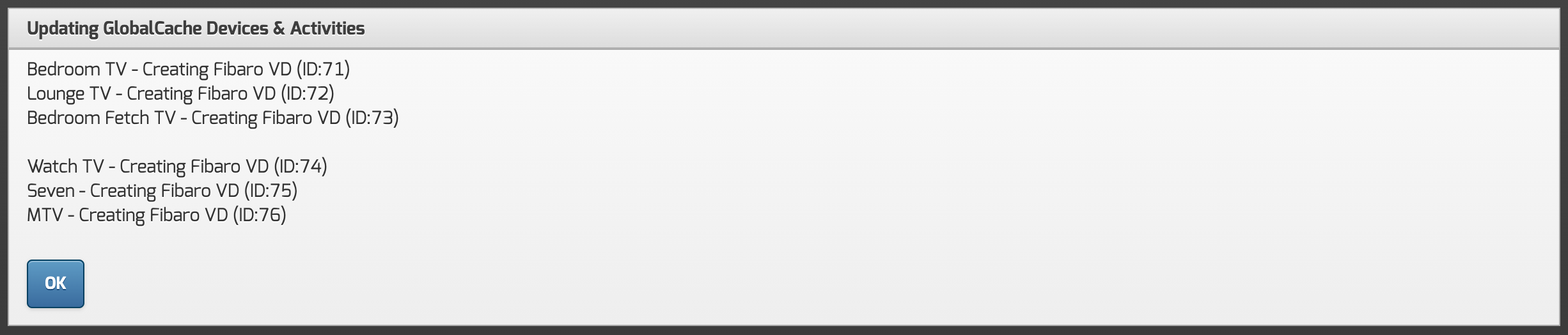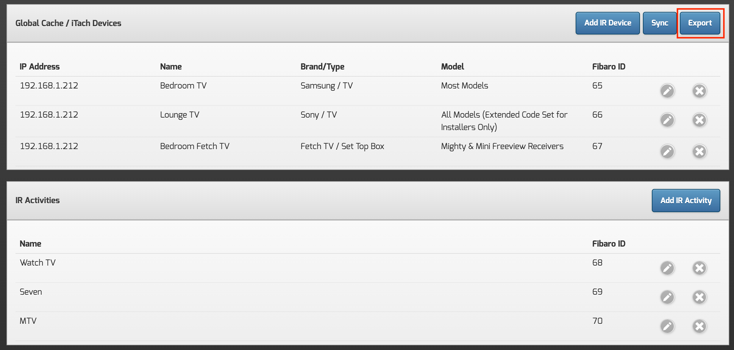This feature has been added to support installers setting up multiple automationbridge's. It will allow you to setup the first bridge, add and configure the GlobalCache devices and activities, export the config, and then import this config into subsequent bridges. Upon the Import process, the VD's will also be created on the destination Fibaro controller.