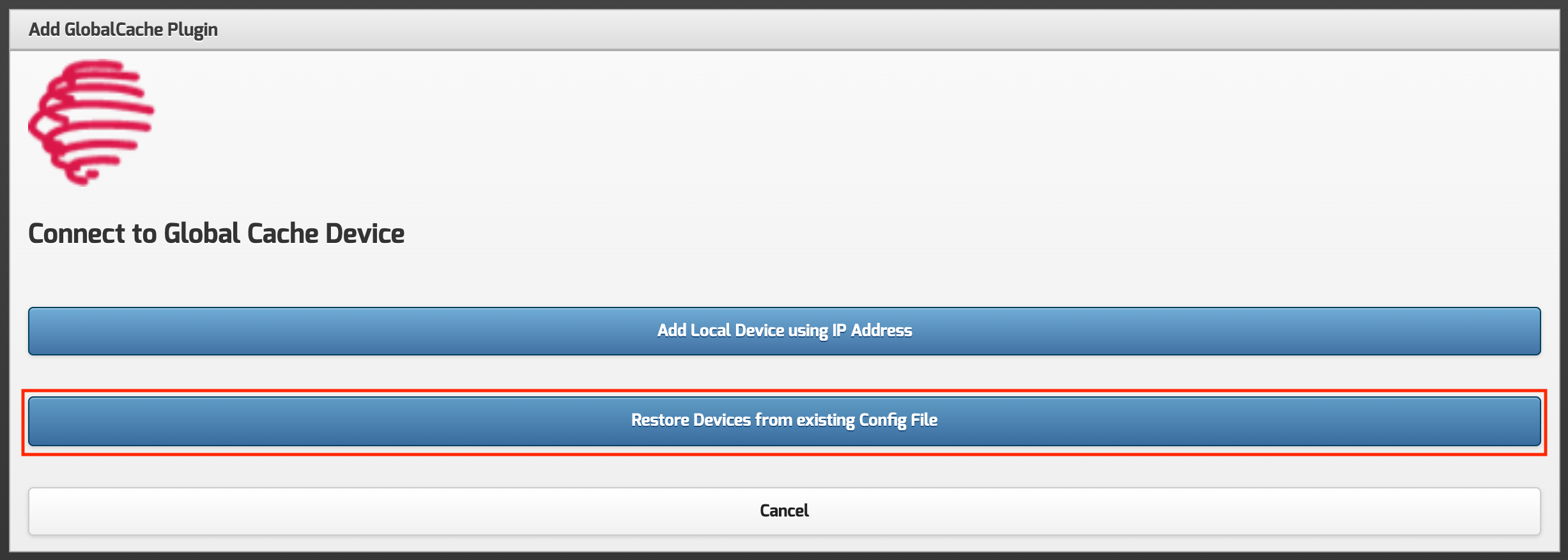 Step 2 - On the destination bridge, click the Add button on the Plugin's page, and then select the option to restore from Config.