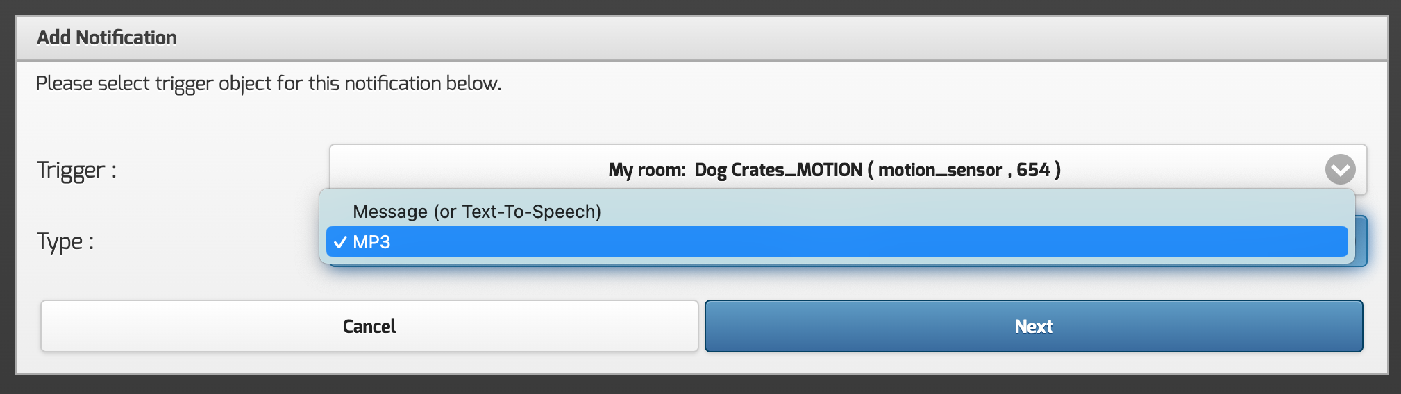 If you select MP3 and click next, you are then given the same trigger options, and the ability to upload a MP3 file.